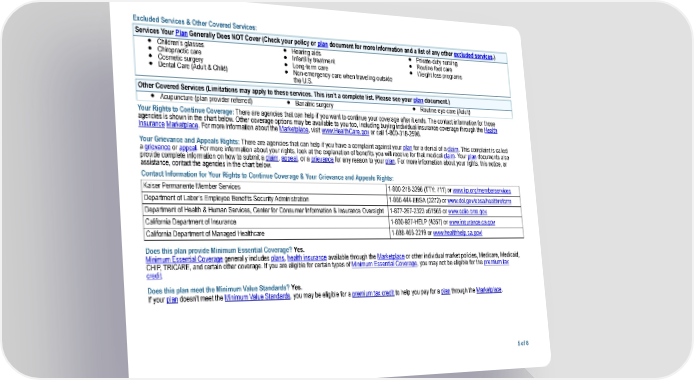 Excluded Services & Other Covered Services: Services Your Plan Generally Does NOT Cover (Check your policy or plan document for more information and a list of any other excluded services.) ● Children's glasses ● Hearing aids ● Private-duty nursing ● Chiropractic care ● Infertility treatment ● Routine foot care ● Cosmetic surgery ● Long-term care ● Weight loss programs ● Dental Care (Adult & Child) ● Non-emergency care when traveling outside the U.S. Other Covered Services (Limitations may apply to these services. This isn’t a complete list. Please see your plan document.) ● Acupuncture (plan provider referred) ● Bariatric surgery ● Routine eye care (Adult) Your Rights to Continue Coverage: There are agencies that can help if you want to continue your coverage after it ends. The contact information for those agencies is shown in the chart below. Other coverage options may be available to you too, including buying individual insurance coverage through the Health Insurance Marketplace. For more information about the Marketplace, visit www.HealthCare.gov or call 1-800-318-2596. Your Grievance and Appeals Rights: There are agencies that can help if you have a complaint against your plan for a denial of a claim. This complaint is called a grievance or appeal. For more information about your rights, look at the explanation of benefits you will receive for that medical claim. Your plan documents also provide complete information on how to submit a claim, appeal, or a grievance for any reason to your plan. For more information about your rights, this notice, or assistance, contact the agencies in the chart below. Contact Information for Your Rights to Continue Coverage & Your Grievance and Appeals Rights: Kaiser Permanente Member Services 1-800-278-3296 (TTY: 711) or www.kp.org/memberservices Department of Labor’s Employee Benefits Security Administration 1-866-444-EBSA (3272) or www.dol.gov/ebsa/healthreform Department of Health & Human Services, Center for Consumer Information & Insurance Oversight 1-877-267-2323 x61565 or www.cciio.cms.gov California Department of Insurance 1-800-927-HELP (4357) or www.insurance.ca.gov California Department of Managed Healthcare 1-888-466-2219 or www.healthhelp.ca.gov/ Does this plan provide Minimum Essential Coverage? Yes. Minimum Essential Coverage generally includes plans, health insurance available through the Marketplace or other individual market policies, Medicare, Medicaid, CHIP, TRICARE, and certain other coverage. If you are eligible for certain types of Minimum Essential Coverage, you may not be eligible for the premium tax credit. Does this plan meet the Minimum Value Standards? Yes. If your plan doesn’t meet the Minimum Value Standards, you may be eligible for a premium tax credit to help you pay for a plan through the Marketplace. 5 of 8