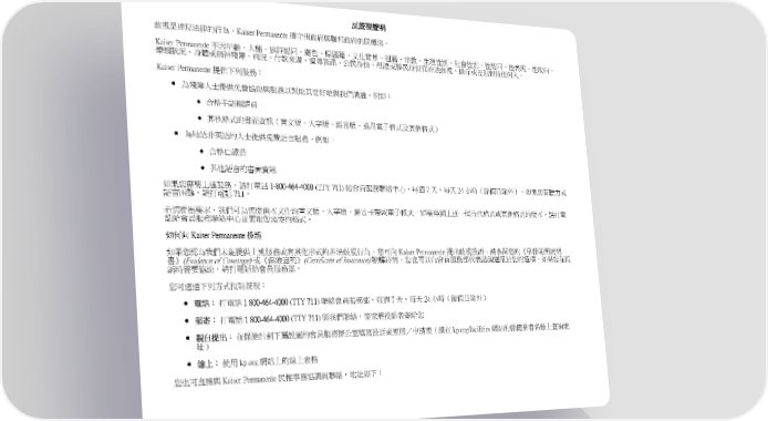 反歧視聲明 歧視是違反法律的行為。Kaiser Permanente遵守州政府與聯邦政府的民權法。 Kaiser Permanente 不因年齡、人種、族群認同、膚色、原國籍、文化背景、祖籍、宗教、生理性別、社會性別、性認同、性表現、性取向、 婚姻狀況、身體或精神殘障、病況、付款來源、遺傳資訊、公民身份、母語或移民身份而非法歧視、排斥或差別對待任何人。 Kaiser Permanente 提供下列服務: ● 為殘障人士提供免費協助與服務以幫助其更好地與我們溝通,例如: ♦ 合格手語翻譯員 ♦ 其他格式的書面資訊(盲文版、大字版、語音版、通用電子格式及其他格式) ● 為母語非英語的人士提供免費語言服務,例如: ♦ 合格口譯員 ♦ 其他語言的書面資訊 如果您需要上述服務,請打電話1-800-464-4000 (TTY 711) 給會員服務聯絡中心,每週7天,每天24小時(節假日除外)。如果您有聽力或 語言困難,請打電話711。 若您提出要求,我們可為您提供本文件的盲文版、大字版、錄音卡帶或電子格式。如要得到上述一種替代格式或其他格式的版本,請打電 話給會員服務聯絡中心並索取您需要的格式。 如何向Kaiser Permanente投訴 如果您認為我們未能提供上述服務或有其他形式的非法歧視行為,您可向Kaiser Permanente提出歧視投訴。請參閱您的《承保範圍說明 書》(Evidence of Coverage) 或《保險證明》(Certificate of Insurance) 瞭解詳情。您也可以向會員服務部代表諮詢適用於您的選項。如果您在投 訴時需要協助,請打電話給會員服務部。 您可透過下列方式投訴歧視: ● 電話: 打電話1 800-464-4000 (TTY 711) 聯絡會員服務部,每週7天,每天24小時(節假日除外) ● 郵寄: 打電話1 800-464-4000 (TTY 711) 與我們聯絡,要求將投訴表寄給您 ● 親自提出: 在保險計劃下屬設施的會員服務辦公室填寫投訴或索賠/申請表(請在kp.org/facilities網站的保健業者名錄上查詢地 址) ● 線上: 使用kp.org網站上的線上表格 您也可直接與Kaiser Permanente民權事務協調員聯絡,地址如下: