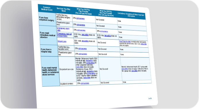 What You Will Pay What You Will Pay Common Services You May Limitations, Exceptions & Other Important Plan Provider Non-Plan Provider Medical Event Need Information (You will pay the least) (You will pay the most) Facility fee (e.g., ambulatory surgery 20% coinsurance Not Covered None If you have center) outpatient surgery Physician/surgeon 20% coinsurance Not Covered None fees Emergency room 20% coinsurance 20% coinsurance None care If you need Emergency medical $150 / trip, deductible does not $150 / trip, deductible does not None immediate medical transportation apply. apply. attention Non-Plan providers covered when temporarily $25 / visit, deductible does not Urgent care Not Covered outside the service area: $25 / visit, deductible apply. does not apply. Facility fee (e.g., 20% coinsurance Not Covered None hospital room) If you have a hospital stay Physician/surgeon 20% coinsurance Not Covered None fee Mental / Behavioral Health: $25 / individual visit, deductible does not apply. 20% coinsurance for other outpatient services, deductible does not apply; Mental / Behavioral Health: $12 / group visit, If you need mental Outpatient services Substance Abuse: $25 / Not Covered deductible does not apply; Substance Abuse: health, behavioral individual visit, deductible does $5 / group visit, deductible does not apply. health, or substance not apply. 20% coinsurance up abuse services to $5 / day for other outpatient services, deductible does not apply. Inpatient services 20% coinsurance Not Covered None 3 of 8