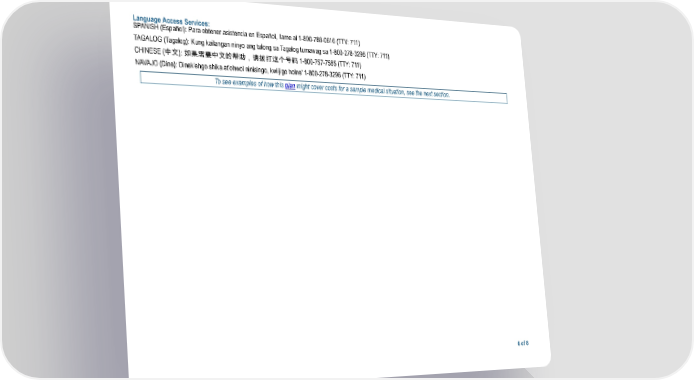Language Access Services: SPANISH (Español): Para obtener asistencia en Español, llame al 1-800-788-0616 (TTY: 711) TAGALOG (Tagalog): Kung kailangan ninyo ang tulong sa Tagalog tumawag sa 1-800-278-3296 (TTY: 711) CHINESE (中文): 如果需要中文的帮助,请拨打这个号码 1-800-757-7585 (TTY: 711) NAVAJO (Dine): Dinek'ehgo shika at'ohwol ninisingo, kwiijigo holne' 1-800-278-3296 (TTY: 711) To see examples of how this plan might cover costs for a sample medical situation, see the next section. 6 of 8