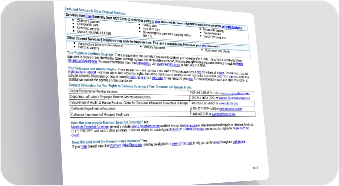 Excluded Services & Other Covered Services: Services Your Plan Generally Does NOT Cover (Check your policy or plan document for more information and a list of any other excluded services.) ● Children's glasses ● Hearing aids ● Private-duty nursing ● Chiropractic care ● Long-term care ● Routine foot care ● Cosmetic surgery ● Non-emergency care when traveling outside ● Weight loss programs ● Dental Care (Adult & Child) the U.S. Other Covered Services (Limitations may apply to these services. This isn’t a complete list. Please see your plan document.) ● Acupuncture (plan provider referred) ● Infertility treatment ● Routine eye care (Adult) ● Bariatric surgery Your Rights to Continue Coverage: There are agencies that can help if you want to continue your coverage after it ends. The contact information for those agencies is shown in the chart below. Other coverage options may be available to you too, including buying individual insurance coverage through the Health Insurance Marketplace. For more information about the Marketplace, visit www.HealthCare.gov or call 1-800-318-2596. Your Grievance and Appeals Rights: There are agencies that can help if you have a complaint against your plan for a denial of a claim. This complaint is called a grievance or appeal. For more information about your rights, look at the explanation of benefits you will receive for that medical claim. Your plan documents also provide complete information on how to submit a claim, appeal, or a grievance for any reason to your plan. For more information about your rights, this notice, or assistance, contact the agencies in the chart below. Contact Information for Your Rights to Continue Coverage & Your Grievance and Appeals Rights: Kaiser Permanente Member Services 1-800-278-3296 (TTY: 711) or www.kp.org/memberservices Department of Labor’s Employee Benefits Security Administration 1-866-444-EBSA (3272) or www.dol.gov/ebsa/healthreform Department of Health & Human Services, Center for Consumer Information & Insurance Oversight 1-877-267-2323 x61565 or www.cciio.cms.gov California Department of Insurance 1-800-927-HELP (4357) or www.insurance.ca.gov California Department of Managed Healthcare 1-888-466-2219 or www.healthhelp.ca.gov/ Does this plan provide Minimum Essential Coverage? Yes. Minimum Essential Coverage generally includes plans, health insurance available through the Marketplace or other individual market policies, Medicare, Medicaid, CHIP, TRICARE, and certain other coverage. If you are eligible for certain types of Minimum Essential Coverage, you may not be eligible for the premium tax credit. Does this plan meet the Minimum Value Standards? Yes. If your plan doesn’t meet the Minimum Value Standards, you may be eligible for a premium tax credit to help you pay for a plan through the Marketplace. 5 of 8