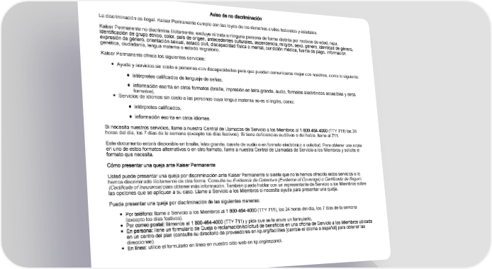 Aviso de no discriminación La discriminación es ilegal. Kaiser Permanente cumple con las leyes de los derechos civiles federales y estatales. Kaiser Permanente no discrimina ilícitamente, excluye ni trata a ninguna persona de forma distinta por motivos de edad, raza, identificación de grupo étnico, color, país de origen, antecedentes culturales, ascendencia, religión, sexo, género, identidad de género, expresión de género, orientación sexual, estado civil, discapacidad física o mental, condición médica, fuente de pago, información genética, ciudadanía, lengua materna o estado migratorio. Kaiser Permanente ofrece los siguientes servicios: ● Ayuda y servicios sin costo a personas con discapacidades para que puedan comunicarse mejor con nosotros, como lo siguiente: ♦ intérpretes calificados de lenguaje de señas, ♦ información escrita en otros formatos (braille, impresión en letra grande, audio, formatos electrónicos accesibles y otros formatos). ● Servicios de idiomas sin costo a las personas cuya lengua materna no es el inglés, como: ♦ intérpretes calificados, ♦ información escrita en otros idiomas. Si necesita nuestros servicios, llame a nuestra Central de Llamadas de Servicio a los Miembros al 1-800-464-4000 (TTY 711) las 24 horas del día, los 7 días de la semana (excepto los días festivos). Si tiene deficiencias auditivas o del habla, llame al 711. Este documento estará disponible en braille, letra grande, casete de audio o en formato electrónico a solicitud. Para obtener una copia en uno de estos formatos alternativos o en otro formato, llame a nuestra Central de Llamadas de Servicio a los Miembros y solicite el formato que necesita. Cómo presentar una queja ante Kaiser Permanente Usted puede presentar una queja por discriminación ante Kaiser Permanente si siente que no le hemos ofrecido estos servicios o lo hemos discriminado ilícitamente de otra forma. Consulte su Evidencia de Cobertura (Evidence of Coverage) o Certificado de Seguro (Certificate of Insurance) para obtener más información. También puede hablar con un representante de Servicio a los Miembros sobre las opciones que se apliquen a su caso. Llame a Servicio a los Miembros si necesita ayuda para presentar una queja. Puede presentar una queja por discriminación de las siguientes maneras: ● Por teléfono: llame a Servicio a los Miembros al 1 800-464-4000 (TTY 711), las 24 horas del día, los 7 días de la semana (excepto los días festivos). ● Por correo postal: llámenos al 1 800-464-4000 (TTY 711) y pida que se le envíe un formulario. ● En persona: llene un formulario de Queja o reclamación/solicitud de beneficios en una oficina de Servicio a los Miembros ubicada en un centro del plan (consulte su directorio de proveedores en kp.org/facilities [cambie el idioma a español] para obtener las direcciones). ● En línea: utilice el formulario en línea en nuestro sitio web en kp.org/espanol.