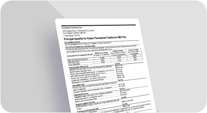 Disclosure Form Part One (continues) 18191 Meyers Nave, a Professional Corporation Home Region: Northern California 1/1/26 through 12/31/26 Principal benefits for Kaiser Permanente Traditional HMO Plan Accumulation Period The Accumulation Period for this plan is January 1 through December 31. Out-of-Pocket Maximums and Deductibles For Services that apply to the Plan Out-of-Pocket Maximum, you will not pay any more Cost Share for the rest of the Accumulation Period once you have reached the amounts listed below. Amounts Per Accumulation Period Self-Only Coverage (a Family of one Member) Family Coverage Each Member in a Family of two or more Members Family Coverage Entire Family of two or more Members Plan Out-of-Pocket Maximum $1,500 $1,500 $3,000 Plan Deductible None None None Drug Deductible None None None Plan Provider Office Visits You Pay Most Primary Care Visits and most Non-Physician Specialist Visits ...... $20 per visit Most Physician Specialist Visits ............................................................. $20 per visit Routine physical maintenance exams, including well-woman exams .... No charge Well-child preventive exams (through age 23 months) .......................... No charge Routine eye exams with a Plan Optometrist .......................................... No charge Urgent care consultations, evaluations, and treatment .......................... $20 per visit Most physical, occupational, and speech therapy .................................. $20 per visit Telehealth Visits You Pay Primary Care Visits and Non-Physician Specialist Visits by interactive video or telephone .................................................................................. No charge Physician Specialist Visits by interactive video or telephone ................. No charge Outpatient Services You Pay Outpatient surgery and certain other outpatient procedures .................. $20 per procedure Most immunizations (including the vaccine) ........................................... No charge Most X-rays and laboratory tests ............................................................ No charge Hospital Inpatient Services You Pay Room and board, surgery, anesthesia, X-rays, laboratory tests, and drugs ..................................................................................................... $500 per admission Emergency Services and Care You Pay Emergency department visits ................................................................. $50 per visit Note: If you are admitted directly to the hospital as an inpatient for covered Services, you will pay the inpatient Cost Share instead of the emergency department Cost Share (see “Hospital Inpatient Services” for inpatient Cost Share) Ambulance Services You Pay Ambulance Services ............................................................................... $50 per trip Prescription Drug Coverage You Pay Covered outpatient items in accord with our drug formulary guidelines: Most generic items (Tier 1) at a Plan Pharmacy or through our mail- order service ....................................................................................... $10 for up to a 100-day supply Most brand-name items (Tier 2) at a Plan Pharmacy or through our mail-order service ............................................................................... $25 for up to a 100-day supply Most specialty items (Tier 4) at a Plan Pharmacy ............................... $25 for up to a 30-day supply Durable Medical Equipment (DME) You Pay DME items as described in the EOC ...................................................... 20% Coinsurance Mental Health Services You Pay Inpatient psychiatric hospitalization ........................................................ $500 per admission Individual outpatient mental health evaluation and treatment ................ $20 per visit Group outpatient mental health treatment .............................................. $10 per visit Substance Use Disorder Treatment You Pay Inpatient detoxification ............................................................................ $500 per admission