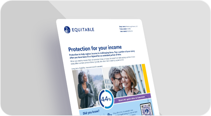 Page 3 Pre-Disability Earnings Means, for sole proprietor, partners, members of a limited liability company taxable as a partnership under the federal income tax laws, or shareholders in a S-Corporation: 1) Your monthly average of earnings from Your Employer reported as ordinary business income (loss) plus any guaranteed payments, less any Section 179 deductions for federal income tax purposes for: a. the one full tax year immediately prior to the date you became disabled; or b. the total number of months You were employed in this capacity, if less than above period; and 2) not contributions You make through a salary reduction agreement with the Employer to: a. an Internal Revenue Code (IRC) Section 401(k), 403(b) or 457 deferred compensation arrangement; b. an executive non-qualified deferred compensation arrangement; or c. a salary reduction arrangement under an IRC Section 125 plan; d. for the same period as above. Pre-Disability Earnings does not include commissions, bonuses, tips and tokens, dividends, capital gains and returns of capital. Pre-Disability Earnings Means, for all other employees, Your regular monthly rate of pay from Your Employer in effect on the date immediately prior to the date you became disabled. Pre-Disability Earnings includes any deductions made for pre-tax contributions to a qualified deferred compensation plan, Section 125 plan or flexible spending account and does not include commissions, bonuses, tips and tokens, overtime pay or any other fringe benefits or extra compensation. Pre-existing condition Means any condition for which you received medical care during the 3 consecutive months prior to your effective date of coverage or the effective date of any increase in coverage. The plan will not pay any benefit, or any increase in benefits, for any disability that results from, or is caused or contributed to by, a pre-existing condition, unless at the time you become disabled, you have been continuously insured for 12 consecutive months. Please see your insurance certificate for details. Frequently Asked Questions Can I work part-time and still satisfy the elimination period? Yes, you can work part-time and still satisfy the elimination period. Any days that you work full-time will not count towards satisfaction of the elimination period. Can I work part-time and still be eligible for a benefit? Yes, as long as you continue to meet the definition of disability you will be eligible for a partial benefit. Are rehabilitation services included? Yes. We will work with you and your physician to plan, adapt, and put into place options and services to meet your return-to-work needs. This may include vocational testing and training, workplace modifications, job placement, transitional work, and other similar services. How much will I receive if I am working part-time and still disabled? During the return-to-work benefit period you can receive up to 100% of your pre-disability earnings from a combination of your part-time earnings and your Long-Term Disability benefit. Following the return-to-work benefit period, your Long-Term Disability benefit will be based on your percentage of earnings loss. For example, if you are losing 50% of your earnings, then your Long-Term Disability benefit would be reduced by half. How are my Long-Term Disability benefits impacted by any other benefits I may be eligible for, such as worker’s compensation or social security disability? Generally speaking your Long-Term Disability benefits will be reduced by any benefits you receive as a result of your disability. Please see your coverage certificate for details. Are my Long-Term Disability benefits taxable? It depends. If you are paying the full cost of the plan with post-tax dollars, then your Long- Term Disability benefits may be non-taxable; however if your employer is paying the full cost or your contributions are on a pre-tax basis, then your benefits are generally taxable. Please consult your HR department for further details on your specific plan. Are disabilities due to mental illness or substance abuse covered? Yes, however the maximum benefit period is limited to 24 months. How do I submit a claim? Contact your employer’s HR department to obtain a claim form or go to https://equitable.com/employee-benefits/customer-service/forms/disability and download a claim form.