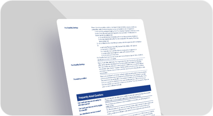 Page 3 Pre-Disability Earnings Means, for sole proprietor, partners, members of a limited liability company taxable as a partnership under the federal income tax laws, or shareholders in a S-Corporation: 1) Your monthly average of earnings from Your Employer reported as ordinary business income (loss) plus any guaranteed payments, less any Section 179 deductions for federal income tax purposes for: a. the one full tax year immediately prior to the date you became disabled; or b. the total number of months You were employed in this capacity, if less than above period; and 2) not contributions You make through a salary reduction agreement with the Employer to: a. an Internal Revenue Code (IRC) Section 401(k), 403(b) or 457 deferred compensation arrangement; b. an executive non-qualified deferred compensation arrangement; or c. a salary reduction arrangement under an IRC Section 125 plan; d. for the same period as above. Pre-Disability Earnings does not include commissions, bonuses, tips and tokens, dividends, capital gains and returns of capital. Pre-Disability Earnings Means, for all other employees, Your regular monthly rate of pay from Your Employer in effect on the date immediately prior to the date you became disabled. Pre-Disability Earnings includes any deductions made for pre-tax contributions to a qualified deferred compensation plan, Section 125 plan or flexible spending account and does not include commissions, bonuses, tips and tokens, overtime pay or any other fringe benefits or extra compensation. Pre-existing condition Means any condition for which you received medical care during the 3 consecutive months prior to your effective date of coverage or the effective date of any increase in coverage. The plan will not pay any benefit, or any increase in benefits, for any disability that results from, or is caused or contributed to by, a pre-existing condition, unless at the time you become disabled, you have been continuously insured for 12 consecutive months. Please see your insurance certificate for details. Frequently Asked Questions Can I work part-time and still satisfy the elimination period? Yes, you can work part-time and still satisfy the elimination period. Any days that you work full-time will not count towards satisfaction of the elimination period. Can I work part-time and still be eligible for a benefit? Yes, as long as you continue to meet the definition of disability you will be eligible for a partial benefit. Are rehabilitation services included? Yes. We will work with you and your physician to plan, adapt, and put into place options and services to meet your return-to-work needs. This may include vocational testing and training, workplace modifications, job placement, transitional work, and other similar services. How much will I receive if I am working part-time and still disabled? During the return-to-work benefit period you can receive up to 100% of your pre-disability earnings from a combination of your part-time earnings and your Long-Term Disability benefit. Following the return-to-work benefit period, your Long-Term Disability benefit will be based on your percentage of earnings loss. For example, if you are losing 50% of your earnings, then your Long-Term Disability benefit would be reduced by half. How are my Long-Term Disability benefits impacted by any other benefits I may be eligible for, such as worker’s compensation or social security disability? Generally speaking your Long-Term Disability benefits will be reduced by any benefits you receive as a result of your disability. Please see your coverage certificate for details. Are my Long-Term Disability benefits taxable? It depends. If you are paying the full cost of the plan with post-tax dollars, then your Long- Term Disability benefits may be non-taxable; however if your employer is paying the full cost or your contributions are on a pre-tax basis, then your benefits are generally taxable. Please consult your HR department for further details on your specific plan. Are disabilities due to mental illness or substance abuse covered? Yes, however the maximum benefit period is limited to 24 months. How do I submit a claim? Contact your employer’s HR department to obtain a claim form or go to https://equitable.com/employee-benefits/customer-service/forms/disability and download a claim form.