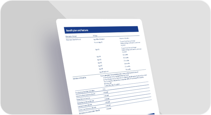 Page 2 Benefit plan and features Elimination Period 90 Days Maximum Benefit Period Age When Disabled Maximum Duration Prior to Age 63 To your Social Security Normal Retirement Age or 48 months, whichever is greater Age 63 To your Social Security Normal Retirement Age or 42 months, whichever is greater Age 64 36 months Age 65 30 months Age 66 27 months Age 67 24 months Age 68 21 months Age 69 and over 18 months Definition of Disability You are prevented from performing one or more of the Essential Duties of: 1) Your Occupation during the Elimination Period; 2) Your Occupation, for the 24 months following the Elimination Period, and as a result Your Current Monthly Earnings are less than 80% of Your Indexed Pre-disability Earnings; and 3) after that, Any Occupation. Pre-Existing Condition Limitation 3/12 Return to Work Incentive Benefit Included Rehabilitation Services Included Rehabilitation Bonus Benefit Included Survivor Income Benefit Included Family Care Deduction Benefit Included Workplace Accommodation Benefit Included Understanding your benefits Commonly Used Terms Elimination Period Means the number of days you need to be disabled before Long-Term Disability benefits begin. Maximum Benefit Period Defines the maximum period of time benefits may be payable.