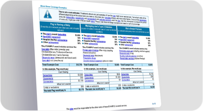 The plan would be responsible for the other costs of these EXAMPLE covered services. 8 of 8 About these Coverage Examples: This is not a cost estimator. Treatments shown are just examples of how this plan might cover medical care. Your actual costs will be different depending on the actual care you receive, the prices your providers charge, and many other factors. Focus on the cost-sharing amounts (deductibles, copayments and coinsurance) and excluded services under the plan. Use this information to compare the portion of costs you might pay under different health plans. Please note these coverage examples are based on self-only coverage. Peg is Having a Baby (9 months of in-network pre-natal care and a hospital delivery) Managing Joe’s Type 2 Diabetes (a year of routine in-network care of a well-controlled condition) Mia’s Simple Fracture (in-network emergency room visit and follow up care) ◼ The plan’s overall deductible $3,000 ◼ The plan’s overall deductible $3,000 ◼ The plan’s overall deductible $3,000 ◼ Specialist copayment $55 ◼ Specialist copayment $55 ◼ Specialist copayment $55 ◼ Hospital (facility) coinsurance 30% ◼ Hospital (facility) coinsurance 30% ◼ Hospital (facility) coinsurance 30% ◼ Other coinsurance 30% ◼ Other coinsurance 30% ◼ Other coinsurance 30% This EXAMPLE event includes services like: Specialist office visits (prenatal care) Childbirth/Delivery Professional Services Childbirth/Delivery Facility Services Diagnostic tests (ultrasounds and blood work) Specialist visit (anesthesia) This EXAMPLE event includes services like: Primary care physician office visits (including disease education) Diagnostic tests (blood work) Prescription drugs Durable medical equipment (glucose meter) This EXAMPLE event includes services like: Emergency room care (including medical supplies) Diagnostic tests (x-ray) Durable medical equipment (crutches) Rehabilitation services (physical therapy) Total Example Cost $12,700 Total Example Cost $5,600 Total Example Cost $2,800 In this example, Peg would pay: In this example, Joe would pay: In this example, Mia would pay: Cost Sharing Cost Sharing Cost Sharing Deductibles $3,000 Deductibles $900 Deductibles $2,100 Copayments $10 Copayments $1,300 Copayments $200 Coinsurance $3,100 Coinsurance $0 Coinsurance $0 What isn’t covered What isn’t covered What isn’t covered Limits or exclusions $60 Limits or exclusions $20 Limits or exclusions $0 The total Peg would pay is $6,170 The total Joe would pay is $2,220 The total Mia would pay is $2,300