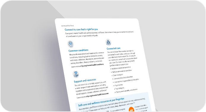(continued from front) Connect to care that’s right for you Everyone’s mental health and wellness journey is different. We’re here to help you connect to the right kind of care based on your unique needs and goals. Common conditions Connected care We provide assessment and treatment for common Your entire Kaiser Permanente care team is conditions, including but not limited to anxiety connected to each other, and to you, through and stress, addiction, depression, personality and your electronic health record. So, it’s easy for eating disorders, sleep problems, and more. our doctors to consult with one another about Learn more at kp.org/mentalhealth/conditions your care. Our team includes many health professionals to support you: • Addiction medicine specialists • Behavioral medicine specialists Support and resources • Case managers • Licensed clinical social workers You can count on us to help support you with • Licensed marriage and family therapists a wide range of treatment options including inpatient and outpatient services, recovery and • Psychiatrists social support, classes, webinars, and more.2 • Psychologists Learn more at kp.org/mentalhealth/resources • Primary and specialty care doctors Self-care and wellness resources at your 昀椀ngertips As a member, you’ll have access to many tools including self-care apps at no cost, wellness coaching, and classes.2 These apps can help you with stress, sleep, depression, and more.3,4,5 Ease your mind with Try personalized programs Headspace Care offers Calm, the #1 app for from myStrength to help 1-on-1 emotional support meditation, relaxation, manage depression, stress, coaching and self-care and sleep.6 anxiety, and more. activities to help with many 7 common challenges. 1. When appropriate and available. 2. Some classes may require a fee. 3. The apps and services described above are not covered under your health plan bene昀椀ts, are not a Medicare-covered bene昀椀t, and are not subject to the terms set forth in your Evidence of Coverage or other plan documents. The apps and services may be discontinued at any time. 4. Calm and myStrength can be used by members 13 and over. The Headspace Care app and services are not available to any members under 18 years old. 5. Some individuals who receive health care services from Kaiser Permanente through state Medicaid programs are not eligible for the Headspace Care app and services. The Headspace Care app and services are not available to anyone enrolled in a Fee-for-Service Medicaid program. 6. Calm is the number 1 app for sleep, meditation, and relaxation, with over 100 million downloads and 1.5 million-plus 5-star reviews. Learn more at calm.com/blog/about. 7. Eligible Kaiser Permanente members can text with a coach using the Headspace Care app for 90 days per year. After the 90 days, members can continue to access the other services available on the Headspace Care app for the remainder of the year at no cost. Kaiser Permanente health plans around the country: Kaiser Foundation Health Plan, Inc., in Northern and Southern California and Hawaii • Kaiser Foundation Health Plan of Colorado • Kaiser Foundation Health Plan of Georgia, Inc., Nine Piedmont Center, 3495 Piedmont Road NE, Atlanta, GA 30305 • Kaiser Foundation Health Plan of the Mid-Atlantic States, Inc., in Maryland, Virginia, and Washington, D.C., 2101 E. Jefferson St., Rockville, MD 20852 • Kaiser Foundation Health Plan of the Northwest, 500 NE Multnomah St., Suite 100, Portland, OR 97232 • Kaiser Foundation Health Plan of Washington or Kaiser Foundation Health Plan of Washington Options, Inc., 1300 SW 27th St., Renton, WA 98057 Learn more at kp.org/mentalhealth 1228716336 October 2023