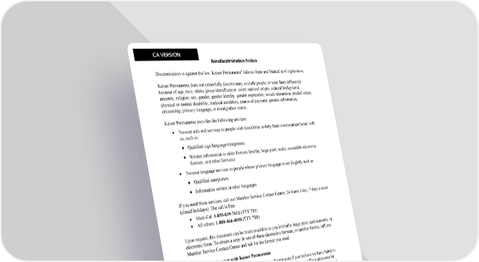 CA VERSION Nondiscrimination Notice Discrimination is against the law. Kaiser Permanente1 follows State and Federal civil rights laws. Kaiser Permanente does not unlawfully discriminate, exclude people, or treat them differently because of age, race, ethnic group identification, color, national origin, cultural background, ancestry, religion, sex, gender, gender identity, gender expression, sexual orientation, marital status, physical or mental disability, medical condition, source of payment, genetic information, citizenship, primary language, or immigration status. Kaiser Permanente provides the following services: • No-cost aids and services to people with disabilities to help them communicate better with us, such as: Qualified sign language interpreters Written information in other formats (braille, large print, audio, accessible electronic formats, and other formats) • No-cost language services to people whose primary language is not English, such as: Qualified interpreters Information written in other languages If you need these services, call our Member Service Contact Center, 24 hours a day, 7 days a week (closed holidays). The call is free: • Medi-Cal: 1-855-839-7613 (TTY 711) • All others: 1-800-464-4000 (TTY 711) Upon request, this document can be made available to you in braille, large print, audiocassette, or electronic form. To obtain a copy in one of these alternative formats, or another format, call our Member Service Contact Center and ask for the format you need. How to file a grievance with Kaiser Permanente You can file a discrimination grievance with Kaiser Permanente if you believe we have failed to provide these services or unlawfully discriminated in another way. You can file a grievance by phone, by mail, in person, or online. Please refer to your Evidence of Coverage or Certificate of Insurance for details. You can call Member Services for more information on the options that apply to you, or for help filing a grievance. You may file a discrimination grievance in the following ways: • By phone: Medi-Cal members may call 1-855-839-7613 (TTY 711). All other members may call 1-800-464-4000 (TTY 711). Help is available 24 hours a day, 7 days a week (closed holidays) • By mail: Download a form at kp.org or call Member Services and ask them to send you a form that you can send back. 1 Kaiser Permanente is inclusive of Kaiser Foundation Health Plan, Inc, Kaiser Foundation Hospitals, The Permanente Medical Group, and the Southern California Medical Group