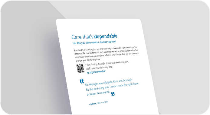 Care that’s dependable For the you who wants a doctor you trust Your health is a lifelong journey, and we want you to have the right doctor to go the distance. We hire doctors and staff who speak more than one language and deliver care that’s sensitive to your culture, ethnicity, and lifestyle. And you can choose or change your doctor anytime. From finding the right doctor to transitioning care, we’ll help you with every step. kp.org/newmember Dr. Weniger was relatable, kind, and thorough. By the end of my visit, I knew I made the right choice in Kaiser Permanente. — Aimee, new member 6