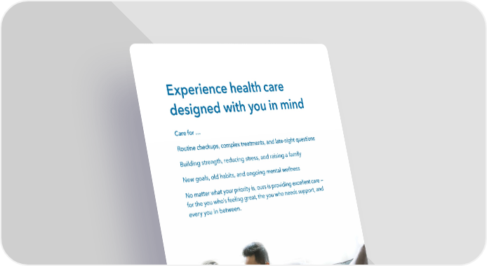 Experience health care designed with you in mind Care for … Routine checkups, complex treatments, and late-night questions Building strength, reducing stress, and raising a family New goals, old habits, and ongoing mental wellness No matter what your priority is, ours is providing excellent care — for the you who’s feeling great, the you who needs support, and every you in between.