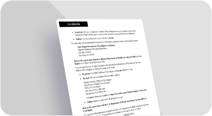 CA VERSION • In person: Fill out a Complaint or Benefit Claim/Request form at a member services office located at a Plan Facility (go to your provider directory at kp.org/facilities for addresses) • Online: Use the online form on our website at kp.org You may also contact the Kaiser Permanente Civil Rights Coordinator directly at the addresses below: Attn: Kaiser Permanente Civil Rights Coordinator Member Relations Grievance Operations P.O. Box 939001 San Diego CA 92193 How to file a grievance with the California Department of Health Care Services Office of Civil Rights (For Medi-Cal Beneficiaries Only) You can also file a civil rights complaint with the California Department of Health Care Services Office of Civil Rights in writing, by phone or by email: • By phone: Call DHCS Office of Civil Rights at 916-440-7370 (TTY 711) • By mail: Fill out a complaint form or send a letter to: Deputy Director, Office of Civil Rights Department of Health Care Services Office of Civil Rights P.O. Box 997413, MS 0009 Sacramento, CA 95899-7413 Complaint forms are available at: http://www.dhcs.ca.gov/Pages/Language_Access.aspx • Online: Send an email to [email protected] How to file a grievance with the U.S. Department of Health and Human Services Office of Civil Rights You can file a discrimination complaint with the U.S. Department of Health and Human Services Office for Civil Rights. You can file your complaint in writing, by phone, or online: • By phone: Call 1-800-368-1019 (TTY 711 or 1-800-537-7697) • By mail: Fill out a complaint form or send a letter to: U.S. Department of Health and Human Services 200 Independence Avenue, SW Room 509F, HHH Building Washington, D.C. 20201 Complaint forms are available at: https://www.hhs.gov/ocr/complaints/index.html • Online: Visit the Office of Civil Rights Complaint Portal at: https://ocrportal.hhs.gov/ocr/portal/lobby.jsf.