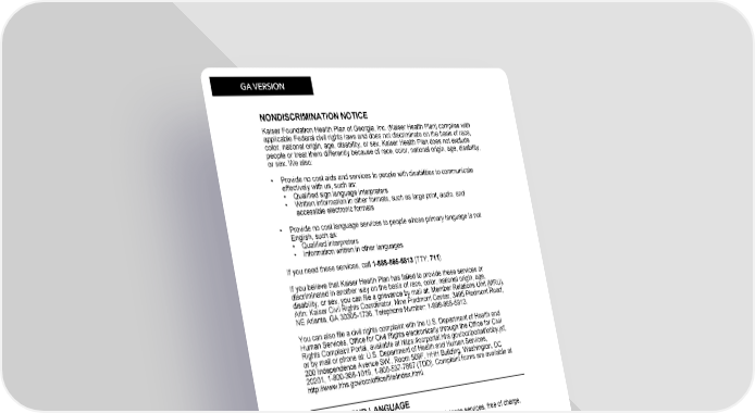 GA VERSION NONDISCRIMINATION NOTICE Kaiser Foundation Health Plan of Georgia, Inc. (Kaiser Health Plan) complies with applicable Federal civil rights laws and does not discriminate on the basis of race, color, national origin, age, disability, or sex. Kaiser Health Plan does not exclude people or treat them differently because of race, color, national origin, age, disability, or sex. We also: • Provide no cost aids and services to people with disabilities to communicate effectively with us, such as: • Qualified sign language interpreters • Written information in other formats, such as large print, audio, and accessible electronic formats • Provide no cost language services to people whose primary language is not English, such as: • Qualified interpreters • Information written in other languages If you need these services, call 1-888-865-5813 (TTY: 711) If you believe that Kaiser Health Plan has failed to provide these services or discriminated in another way on the basis of race, color, national origin, age, disability, or sex, you can file a grievance by mail at: Member Relations Unit (MRU), Attn: Kaiser Civil Rights Coordinator, Nine Piedmont Center, 3495 Piedmont Road, NE Atlanta, GA 30305-1736. Telephone Number: 1-888-865-5813. You can also file a civil rights complaint with the U.S. Department of Health and Human Services, Office for Civil Rights electronically through the Office for Civil Rights Complaint Portal, available at https://ocrportal.hhs.gov/ocr/portal/lobby.jsf, or by mail or phone at: U.S. Department of Health and Human Services, 200 Independence Avenue SW., Room 509F, HHH Building, Washington, DC 20201, 1-800-368-1019, 1-800-537-7697 (TDD). Complaint forms are available at http://www.hhs.gov/ocr/office/file/index.html. ____________________________________________________________________ HELP IN YOUR LANGUAGE ATTENTION: If you speak English, language assistance services, free of charge, are available to you. Call 1-888-865-5813 (TTY: 711). አአማማርኛርኛ (Amharic) ማስታማስታወሻወሻ: የሚናገሩት ቋንቋ ኣማርኛ ከሆነ የትርጉም እርዳታ ድርጅቶች፣ በነጻ ሊያግዝዎት ተዘጋጀተዋል፡ ወደ ሚከተለውቁጥርይደውሉ1-888-865-5813(TTY:711). .ناجملاب كل رفاوتت ةيوغللا ةدعاسملا تامدخ نإف ،ةيبرعلا ثدحتت تنك اذإ :ةظوحلم (Arabic) ةيبرعلا .)711 :TTY( 1-888-865-5813 مقرب لصتا 中 中文文(Chinese) 注意:如果您使用繁體中文注意: ,您可以免費獲得語言援助服務。請致電 1-888-865-5813(TTY:711)。 یارب ناگيار تروصب ینابز تلايهست ،دينک یم وگتفگ یسراف نابز هب رگا :هجوت (Farsi) یسراف .ديريگب سامت (711 :TTY) 1-888-865-5813 اب .دشاب یم مهارف امش 60577109_ACA_1557_MarCom_GA_2017_Taglines