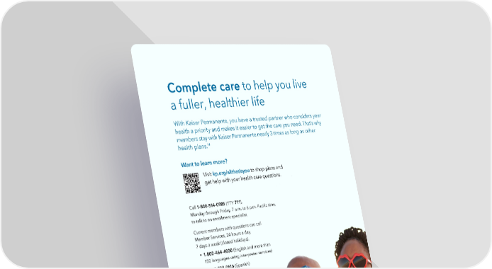 Complete care to help you live a fuller, healthier life With Kaiser Permanente, you have a trusted partner who considers your health a priority and makes it easier to get the care you need. That’s why members stay with Kaiser Permanente nearly 3 times as long as other 14 health plans. Want to learn more? Visit kp.org/allthatisyou to shop plans and get help with your health care questions. Call 1-800-514-0985 (TTY 711), Monday through Friday, 7 a.m. to 6 p.m. Pacific time, to talk to an enrollment specialist. Current members with questions can call Member Services, 24 hours a day, 7 days a week (closed holidays). • 1-800-464-4000 (English and more than 150 languages using interpreter services) • 1-800-788-0616 (Spanish) • 1-800-757-7585 (Chinese dialects) • 711 (TTY)