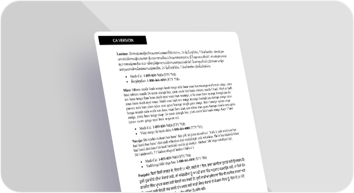 CA VERSION Ǿ Ǿ Ǿ Ǿ Laotian: ǡǰ ǏǭǚǔǾǥǕǸǧDz ǨǖǿǭǚǟǭǦǭǛȃ ǸǦǕǑǾǭǻǧǿǹǏǾǙǾ ǭǚ, 24 ǔǵ ǥǺǡǒǗȃ ǥǬ ǚ , 7 ǥǬ ǚ Ǘȃ ǨǭǙǯ ǖ . ǙǾ ǭǚǕǬ ǒ Ǧǭ Ƕ Ǿ Ǿ ǡǭǖǐȃ Ǜȃ Ǥǯ ǏǭǚǝǿǹǜǟǭǦǭ ǧDz ǸǨǏǫǦǭǚǙǰ ǹǜǸ ǜǬ ǚ ǟǭǦǭǐǨǒǙǾǭǚ ǧDz ǻǚǩǛǹǛǛǨDz ǚǼǖǿ. ǙǾǭǚǕǬ ǒ Ǧǭǡǭǖǐȃ Ǵ Ǵ Ƕ Ƕ Ǿ Ǿ Ǿ ǨǜǫǏǨǚǔǾǥǕǸ Ǧǰ ǡ ǹǤǫ ǸǑDz ǨǒǡDz ǢǦǫǘǭǚǛȃ Ǥǯ ǏǭǚǐǨǒǟǥǏǸ ǩǵ ǭ Ǽǖǿ. ǺǙǧǭǦǚǗǯ ǖ Ǘȃ Ǜȃ Ǥǯ ǏǭǚǦǫǡǭǔǯ Ǐ Ǵ Ǵ dz Ǿ Ǿ Ǿ Ǿ ǐǨǒǟǥǏǸǩǵ ǭ ǸǟDz Ǩǐȃ ǑǥǭǡǔǾǥǕǸǧDz Ǩ, 24 ǔǵ ǥǺǡǒǗȃ ǥǬ ǚ , 7 ǥǬ ǚ Ǘȃ ǨǭǙǯ ǖ (ǜǯ ǖ ǻǚǥǬ ǚ ǟǬ Ǐ ). Ƕ • Medi-Cal: 1-855-839-7613 (TTY 711) Ǿ • ǨDz ǚǽǙǬ ǒ ȏǵ ǖ : 1-800-464-4000 (TTY 711) Mien: Mbenc nzoih liouh wangv-henh tengx nzie faan waac bun muangx meih maiv cingv, yietc hnoi mbenc maaih 24 norm ziangh hoc, yietc norm leiz baaix mbenc maaih 7 hnoi. Meih se haih tov heuc tengx faan benx meih nyei waac bun muangx, a’fai zoux benx nyungc horngh jaa-sic zoux benx meih nyei waac. Meih corc haih tov tengx nyungc horngh jaa-dorngx aengx caux jaa-sic nzie bun yiem njiec zorc goux baengc zingh gorn zangc. Beiv hnangv qiemx zuqc longc mienh nzie weih nor douc waac lorx taux yie mbuo ziux goux baengc mienh nyei gorn zangc, yietc hnoi tengx duqv 24 norm ziangh hoc, yietc norm leiz baaix tengx duqv 7 hnoi (simv cuotv gingc nyei hnoi se guon oc). • Medi-Cal: 1-855-839-7613 (TTY 711) • Yietc zungv da’nyeic deix: 1-800-464-4000 (TTY 711) Navajo: Díí hózhó nízhoní bee hane’ dóó jíik’ah jóóní doonílwo’. Ndik’é yádi naaltsoos bee haz’áanii bee hane’ dóó yádi nihookaa dóó nádááhágíí yádi nihookaa. Shí éí bee háídínii bibee’ haz’áanii dóó bee t’ah kodí bízíkinii wo’da’gi doolyé. Ahéhee’ bik’ehgo nohólǫǫn’ígíí, 24 t’áádawołíí, 7 t’áádawołíígo (t’áadoo t’áálwo’). • Medi-Cal: 1-855-839-7613 (TTY 711) • Yadilzingo biłk’ehgo bee: 1-800-464-4000 (TTY 711) Punjabi: bUR b?^c ZaAN Pf, bPR Pf 24 B† I, f _TNf Pf 7 bPR, Va]a ^_a7Na Nd_aKf Z8 9SZUQ _g‘ Nd^€ PdVa]c; Pc64 ^f\a\ Z8, F ^WNJAYc64 R e† 6SMc Va©a b\NJ D 5Rd\aP ?Y\a9M Z8, F b?^f \NJ @ ?Y ^?Pf _h‘ Nd^€ ^aKc64 ^db\Qa\ b\NJ D \c ^_a7? ^aQR 5Nf TaYWgI b\NJ D S‡aSN ?YR Z8 UfRNc 9S?YM Z8 UfRNc ?Y ^?Pf _‘ WPP Z8 ^aKc W‚UY ^f\a\ Pf ^†SY? ?PY R e† , bPR Pf 24 B† I, f _TNf Pf 7 bPR (EdNJIc64 \aZf bPR U† P Yb_†Pa _g) ?aNJZ ?Yh‘ • Medi-Cal: 1-855-839-7613 (TTY 711) • _hY ^aYf: 1-800-464-4000 (TTY 711) Russian: Языковая помощь доступна для вас бесплатно круглосуточно, ежедневно. Вы можете запросить услуги переводчика или материалы, переведенные на ваш язык или в альтернативные форматы. Вы также можете заказать вспомогательные средства и приспособления. Для получения помощи позвоните в наш центр обслуживания участников ежедневно, круглосуточно (кроме праздничных дней). • Medi-Cal: 1-855-839-7613 (линия TTY 711) • Все остальные: 1-800-464-4000 (линия TTY 711)