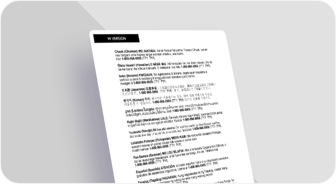 HI VERSION Chuuk (Chukese) MEI AUCHEA: Ika iei foosun fonuomw: Foosun Chuuk, iwe en mei tongeni omw kopwe angei aninisin chiakku, ese kamo. Kori 1-800-966-5955 (TTY: 711). ʻŌlelo Hawaiʻi (Hawaiian) E NĀNĀ MAI: Inā hoʻopuka ʻoe i ka ʻōlelo Hawaiʻi, hiki iā ʻoe ke loaʻa i ke kōkua manuahi. E kelepona i ka helu 1-800-966-5955 (TTY: 711). Iloko (Ilocano) PAKDAAR: No agsasaoka iti Ilokano, dagiti awan bayadna a serbisio a para iti beddeng ti lengguahe ket sidadaan para kenka. Awagan ti 1-800-966-5955 (TTY: 711) 日本語(Japanese)注意事項:日本語を話される場合、無料の言語支援をご利用い 日本語 注意事項: ただけます。1-800-966-5955(TTY:711)まで、お電話にてご連絡ください。 한한국국어어 (Korean) 주주의의: : 한국어를 사용하시는 경우, 언어 지원 서비스를 무료로 이용하실 수 있습니다. 1-800-966-5955(TTY: 711)번으로 전화해 주십시오. ລາວ ໂປດຊາບ: ້ ລາວ (Laotian) ໂປດຊາບ: ຖ້າວ່າ ທ່ານເວ າພາສາ ລາວ, ການບໍ ລິ ການຊ່ວຍເຫຼື ອດ້ານພາສາ, ່ ໂດຍບໍ ເສັ ຽຄ່າ, ແມ່ນມີ ພ້ອມໃຫ້ທ່ານ. ໂທຣ 1-800-966-5955 (TTY: 711). Kajin Majōḷ (Marshallese) LALE: Ñe kwōj kōnono Kajin Ṃajōḷ, kwomaroñ bōk jerbal in jipañ ilo kajin ṇe aṃ ejjeḷọk wōṇāān. Kaalọk 1-800-966-5955 (TTY: 711). Naabeehó (Navajo) Díí baa akó nínízin: Díí saad bee yáníłti’go Diné Bizaad, saad bee áká’ánída’áwo’déé’, t’áá jiik’eh, éí ná hóló, koji’ hódíílnih 1-800-966-5955 (TTY: 711). ̖̖ ̖ ̖ Lokaiahn Pohnpei (Pohnpeian) MEHN KAIR: Ma komw kin lokiaiahn Pohnpei, wasahn sawas en palien lokaia kak sawas ni sohte isais. Koahl nempe 1-800-966-5955 (TTY: 711). Faa-Samoa (Samoan) MO LOU SILAFIA: Afai e te tautala Gagana fa'a Sāmoa, o loo iai auaunaga fesoasoani, e fai fua e leai se totogi, mo oe, Telefoni mai: 1-800-966-5955 (TTY: 711). Español (Spanish) ATENCIÓN: si habla español, tiene a su disposición servicios gratuitos de asistencia lingüística. Llame al 1-800-966-5955 (TTY: 711). Tagalog (Tagalog) PAUNAWA: Kung nagsasalita ka ng Tagalog, maaari kang gumamit ng mga serbisyo ng tulong sa wika nang walang bayad. Tumawag sa 1-800-966-5955 (TTY: 711). Lea Faka-Tonga (Tongan) FAKATOKANGA’I: Kapau ‘oku ke Lea Faka-Tonga, ko e kau tokoni fakatonu lea ‘oku nau fai atu ha tokoni ta’etotongi, pea teke lava ‘o ma’u ia. Telefoni mai 1-800-966-5955 (TTY: 711). Tiếng Việt (Vietnamese) CHÚ Ý: Nếu bạn nói Tiếng Việt, có các dịch vụ hỗ trợ ngôn ngữ miễn phí dành cho bạn. Gọi số 1-800-966-5955 (TTY: 711). 60577110_ACA_1557_MarCom_HI_2017_Taglines