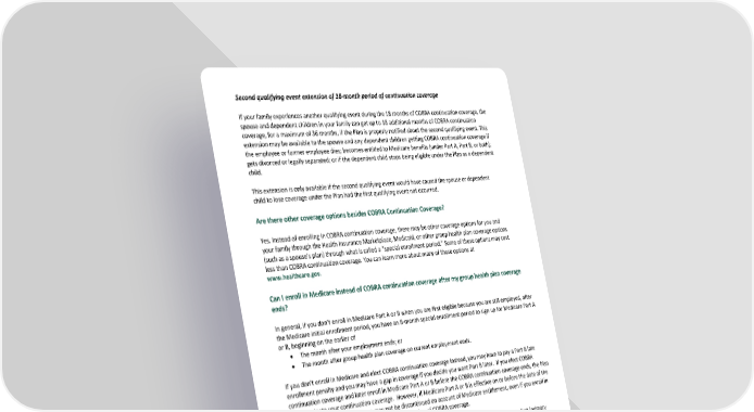 Second qualifying event extension of 18-month period of continuation coverage If your family experiences another qualifying event during the 18 months of COBRA continuation coverage, the spouse and dependent children in your family can get up to 18 additional months of COBRA continuation coverage, for a maximum of 36 months, if the Plan is properly notified about the second qualifying event. This extension may be available to the spouse and any dependent children getting COBRA continuation coverage if the employee or former employee dies; becomes entitled to Medicare benefits (under Part A, Part B, or both); gets divorced or legally separated; or if the dependent child stops being eligible under the Plan as a dependent child. This extension is only available if the second qualifying event would have caused the spouse or dependent child to lose coverage under the Plan had the first qualifying event not occurred. Are there other coverage options besides COBRA Continuation Coverage? Yes. Instead of enrolling in COBRA continuation coverage, there may be other coverage options for you and your family through the Health Insurance Marketplace, Medicaid, or other group health plan coverage options (such as a spouse’s plan) through what is called a “special enrollment period.” Some of these options may cost less than COBRA continuation coverage. You can learn more about many of these options at www.healthcare.gov. Can I enroll in Medicare instead of COBRA continuation coverage after my group health plan coverage ends? In general, if you don’t enroll in Medicare Part A or B when you are first eligible because you are still employed, after the Medicare initial enrollment period, you have an 8-month special enrollment period to sign up for Medicare Part A or B, beginning on the earlier of • The month after your employment ends; or • The month after group health plan coverage on current employment ends. If you don’t enroll in Medicare and elect COBRA continuation coverage instead, you may have to pay a Part B late enrollment penalty and you may have a gap in coverage if you decide you want Part B later. If you elect COBRA continuation coverage and later enroll in Medicare Part A or B before the COBRA continuation coverage ends, the Plan may terminate your continuation coverage. However, if Medicare Part A or B is effective on or before the date of the COBRA election, COBRA coverage may not be discontinued on account of Medicare entitlement, even if you enroll in the other part of Medicare after the date of the election of COBRA coverage. If you are enrolled in both COBRA continuation coverage and Medicare, Medicare will generally pay first (primary payer) and COBRA continuation coverage will pay second. Certain plans may pay as if secondary to Medicare, even if you are not enrolled in Medicare. For more information vision https://www.medicare.gov/medicare-and-you. If you have questions Questions concerning your Plan or your COBRA continuation coverage rights should be addressed to the contact or contacts identified below. For more information about your rights under the Employee Retirement Income Security Act (ERISA), including COBRA, the Patient Protection and Affordable Care Act, and other laws affecting group health plans, contact the nearest Regional or District Office of the U.S. Department of Labor’s Employee Benefits Security Administration (EBSA) in your area or visit www.dol.gov/ebsa. (Addresses and phone numbers of Regional and District EBSA Offices are available through EBSA’s website.) For more information about the Marketplace, visit www.HealthCare.gov.