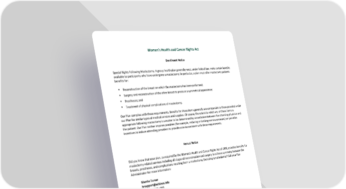 Women’s Health and Cancer Rights Act Enrollment Notice Special Rights Following Mastectomy. A group health plan generally must, under federal law, make certain benefits available to participants who have undergone a mastectomy. In particular, a plan must offer mastectomy patients benefits for: Reconstruction of the breast on which the mastectomy has been performed; Surgery and reconstruction of the other breast to produce a symmetrical appearance; Prostheses; and Treatment of physical complications of mastectomy. Our Plan complies with these requirements. Benefits for these items generally are comparable to those provided under our Plan for similar types of medical services and supplies. Of course, the extent to which any of these items is appropriate following mastectomy is a matter to be determined by consultation between the attending physician and the patient. Our Plan neither imposes penalties (for example, reducing or limiting reimbursements) nor provides incentives to induce attending providers to provide care inconsistent with these requirements. Annual Notice Did you know that your plan, as required by the Women’s Health and Cancer Rights Act of 1998, provides benefits for mastectomy-related services including all stages of reconstruction and surgery to achieve symmetry between the breasts, prostheses, and complications resulting from a mastectomy (including lymphedema)? Call your Plan Administrator for more information: Marsha Turner hrsupport@achieva.info 888-272-7229 x443