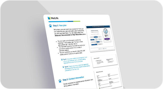 Step 2: Your plan What does your pet need to be covered for? Here you can customize your plan and build a plan that best fits you and your best friend. You can easily select from Balanced, Recommended or High Deductible options. You can quote up to three pets at a time by • selecting “+ Add another pet.” For four or more pets, please call 1-800-GET-MET8. The Optional Preventive Care add-on means you • can receive reimbursement for a variety of wellness matters. You can customize your benefit, deductible and • reimbursement levels for the perfect plan. Tip #1: If you want additional coverage for more routine care/wellness items, consider adding Optional Preventive Care to your plan. Tip #2: Please ensure you select any applicable discounts in the “Discounts Applied” section before proceeding to the next step. Step 3: Contact information Simply complete the required contact information and billing address information. Step 4: Credit card information Complete your payment information.