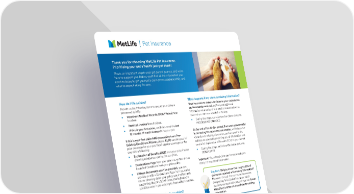 Pet Insurance ' Thank you for choosing MetLife Pet Insurance. Prioritizing your pet’s health just got easier. This is an important step in your pet parent journey, and we’re here to support you. Below, you’ll fnd all the information you need to know to get your pet’s claim processed smoothly, and what to expect along the way. How do I fle a claim? Provide us the following items to ensure your claim is processed quickly: • Veterinary Medical Records (SOAP Notes) from Incident. • Itemized Invoice from Incident. • If this is your frst claim, we'll also need the last 12 months of medical records for your pet If this is your frst claim AND your policy has a Pre- Existing Conditions Waiver, please ALSO send in proof of prior coverage for your pet. Proof of prior coverage can be one of the following: • Explanation of Benefts (EOB) from your prior insurer showing reimbursement for the condition. • Declarations Page from your prior insurer that shows Excluded Conditions from your prior policy. • If these documents can’t be provided, you can provide us with a Declarations Page from your prior insurer showing dates your policy was in efect and supporting doctor’s SOAP notes that indicate the condition wasn’t pre-existing to those efective dates. What happens after I submit my claim? 1. Once we receive your documents, we queue them to confrm their contents and send a receipt to you at the email address used to submit the document. • We’ll also display a banner notifcation to confrm successful submission when you send claim documents to us via the MetLife Pet Insurance Mobile App or MyPets portal. 2. To track the progress of your claim, we’ll provide regular updates on the status in the MetLife Pet Insurance Mobile App and MyPets portal. • During this stage, we’ll show the claims status as: REVIEWING 3. Once we have assigned your claim documents to your policy, we’ll send an email* to the address on your policy stating that your claim has been received. • During this stage, we’ll show the claims status as: PROCESSING What happens if my claim is missing information? If we’re unable to make a decision on your claim based on documents received, we’ll request additional information via a series of four email communications to you and your vet over a period of 10 days. • During this stage, we will show the claims status as: PROCESSING ON HOLD At the end of the 10-day period, if we were unsuccessful in collecting the requested information, we’ll close your claim due to missing information, send an email to the address on your policy notifying you of this decision and send a full Explanation of Benefts (EOB) to you via mail. • During this stage, we’ll show the claims status as: COMPLETED Important: Your closed claim can be reopened upon receipt of requested information. How will I know that a decision was made on my claim? Once we’ve made a decision on your claim, we’ll email the outcome (approved, denied or applied to your deductible) to the address on your policy. Additionally, you’ll receive a full Explanation of Benefts (EOB) through email and mail, accessible on the MyPets Portal. • During this stage, we’ll show the claims status as: COMPLETED Want to talk to a MetLife Pet Advocate about the claims process? Please call 1-800-GET-MET8 (1-800-438-6388). *All the above email communications will come from MetLife Pet Insurance < pet_info@pets.metlife.com >, be sure to check spam folders if you are not receiving these communications. Fun Fact: Did you know that roughly 25% of claims are received with missing information? However, through the communication series designed by MetLife Pet Insurance, which connects our team with you and your vet, fewer than 2% of claims are closed due to missing information.