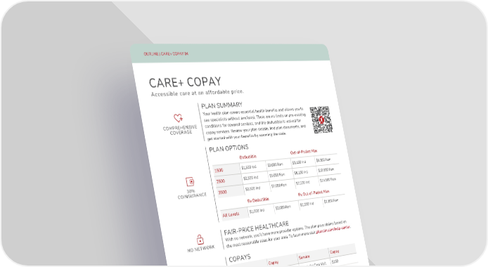 1506 S Silicon Way Suite 2B, St. George, UT 84770 | 888-920-7526 | planstin.com OUTLINE | CARE+ COPAY 04 CARE+ COPAY Deductible Out-of-Pocket Max 1500 $1,500 Ind $3,000 Fam $3,100 Ind $6,500 Fam 2500 $2,500 Ind $5,000 Fam $5,100 Ind $10,500 Fam 3500 $3,500 Ind $7,000 Fam $7,100 Ind $14,500 Fam Service Copay Primary Care Visit $50 Urgent Care Visit $100 COPAYS WITH DEDUCTIBLE WAIVED 30% COINSURANCE Service Copay Specialist Care Visit $100 Emergency Care $500 PLANSTINRX Prescription Tier Retail (First Fill) Mail Order (All Refills) Tier 1: Generic $10 $20 Tier 2: Preferred Brand $50 $100 Tier 3: Non-Preferred Brand $100 $100 Tier 4: Specialty | 30% coinsurance after Rx deductible | $500 max paid per Rx, per month NO NETWORK COMPREHENSIVE COVERAGE Rx Deductible Rx Out-of-Pocket Max All Levels $1,000 Ind $2,000 Fam $1,200 Ind $2,100 Fam Accessible care at an affordable price. FAIR-PRICE HEALTHCARE With no network, youll have more provider options. The plan pays claims based on the most reasonable rates for your area. To learn more visit planstin.com/help-center . Your health plan covers essential health benefits and allows you to see specialists without a referral. There are no limits on pre-existing conditions for covered services, and the deductible is waived for copay services. Review your plan details, find plan documents, and get started with your benefits by scanning the code. PLAN SUMMARY Home delivery and significant discounts. Visit planstinrx.com to get started. PRESCRIPTIONS COPAYS PLAN OPTIONS