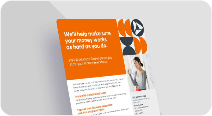 Talk with me today to schedule your financial wellness conversation. Melissa Heckman melissa.heckman@pnc.com (412) 237-0775 NMLS 1842254 *Carrier fees for data usage may apply PNC WorkPlace Banking® lets you show your money boss. help make sure your money works as hard as you do. With smart, easy-to-use tools that let you track and manage your money how and when you want, our bank-at-work program helps you take control today and plan wisely for down the road. And that’s not all: Work with a dedicated team PNC WorkPlace Banking® provides personalized information and guidance to help you select the products and services that are best for your needs. Tap into free financial education and 1-to-1 appointments Get insights and guidance to help you make smart money decisions at every stage of your financial journey. You may earn a $300 reward when your new PNC Mortgage is funded1 Offer is available with a qualifying PNC WorkPlace Banking checking account. Explore more WorkPlace Banking offers that may be available to you2 Visit pnc.com/workplaceoffers