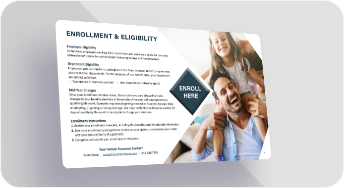 3 ENROLLMENT & ELIGIBILITY Employee Eligibility All full-time employees working 32 or more hours per week are eligible for company offered benefit plans first of the month following 60 days of FT employment. Dependent Eligibility Employees who are eligible to participate in the Salus Homcare benefit program may also enroll their dependents. For the purposes of our benefit plans, your dependents are defined as follows: • Your spouse or domestic partner • Your dependent children to age 26 Mid-Year Changes Once your enrollment window closes, the only time you are allowed to make changes to your benefits elections in the middle of the year is if you experience a qualifying life event. Examples may include getting married or divorced, having a baby or adopting, or gaining or losing coverage. You must notify Human Resources within 30 days of qualifying life event to be eligible to change your elections. Enrollment Instructions 1. Review your enrollment materials, including this benefit guide for valuable information. 2. Take your enrollment package home to discuss your options and evaluate your needs with your spouse/family (if applicable). 3. Complete and submit your enrollment in Viventium. Your Human Resource Contact: Sunny Song | ssong@salushomecare.com | 949-390-7308 ENROLL HERE