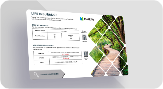 8 LIFE INSURANCE You can't put a price tag on your life, but you can protect your loved ones with life insurance in the event of a premature loss. BASIC LIFE AND AD&D - Full-time employees are automatically enrolled in this employer-paid coverage. Available Coverage $10,000 Flat Benefit Reductions Age 65 70 Reduction 35% 50% VOLUNTARY LIFE AND AD&D - You must submit an application and be approved to be enrolled in this employee- paid coverage. EMPLOYEE $10,000 Minimum to $500,000 Max in $10,000 increments GI = $100,000 SPOUSE $5,000 Minimum to $100,000 Max. $5,000 Increments GI = $25,000 CHILD Flat $1,000, $2,000, $4,000, $5,000, or $10,000 TERM LIFE INSURANCE 101 Review Plan Summary Basic Life Voluntary Life
