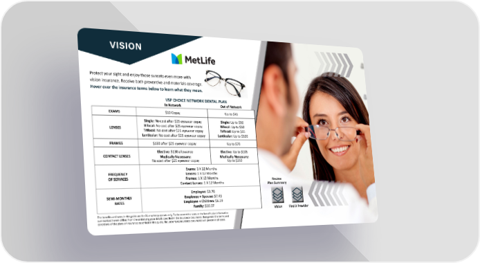7 VISION Protect your sight and enjoy those sunsets even more with vision insurance. Receive both preventive and materials coverage. Hover over the insurance terms below to learn what they mean. EXAMS $10 Copay Up to $45 LENSES Single: No cost after $25 eyewear copay Bifocal: No cost after $25 eyewear copay Trifocal: No cost after $25 eyewear copay Lenticular: No cost after $25 eyewear copay Single: Up to $30 Bifocal: Up to $50 Trifocal: Up to $65 Lenticular: Up to $100 FRAMES $130 after $25 eyewear copay Up to $70 CONTACT LENSES Elective: $130 allowance Medically Necessary: No cost after $25 eyewear copay Elective: Up to $105 Medically Necessary: Up to $210 FREQUENCY OF SERVICES Exams: 1 X 12 Months Lenses: 1 X 12 Months Frames: 1 X 12 Months Contact Lenses: 1 X 12 Months SEMI-MONTHLY RATES Employee: $3.70 Employee + Spouse: $7.43 Employee + Children: $6.29 Family: $10.37 VSP CHOICE NETWORK DENTAL PLAN In Network Out of Network The benefits and rates in this guide are for illustrative purposes only. To the extent the rates or the benefit plan information summarized herein differs from the underlying plan details specified in the insurance documents that govern the terms and conditions of the plans of insurance described in this guide, the underlying insurance documents will govern in all cases. Review Plan Summary Vision Find A Provider