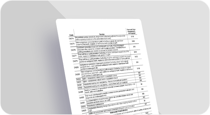 Page 9 of 22 MET245_SOB_CA (01/25) Fs/f GCERT2010-DHMO-SOB sob Code Service Your and Your Dependent's Co-Payment D4274 Mesial/distal wedge procedure, single tooth (when not performed in conjunction with surgical procedures in the same anatomical area) $100 D4275 Non-autogenous connective tissue graft (including recipient site and donor material) first tooth, implant, or edentulous tooth position in graft $380 D4276 Combined connective tissue and pedicle graft, per tooth. Advanced gingival recession often cannot be corrected with a single procedure. Combined tissue grafting procedures are needed to achieve the desired outcome. $75 D4277 Free soft tissue graft procedure (including recipient and donor surgical sites) first tooth, implant or edentulous tooth position in graft $245 D4278 Free soft tissue graft procedure (including recipient and donor surgical sites) each additional contiguous tooth, implant or edentulous tooth position in same graft site $123 D4283 Autogenous connective tissue graft procedure (including donor and recipient surgical sites) – each additional contiguous tooth, implant or edentulous tooth position in same graft site $38 D4285 Non-autogenous connective tissue graft procedure (including recipient surgical site and donor material) – each additional contiguous tooth, implant or edentulous tooth position in same graft site $190 D4322 Splint - intracoronal; natural teeth or prosthetic crowns $95 D4323 Splint - extracoronal; natural teeth or prosthetic crowns $85 D4341 Periodontal scaling and root planing – four or more teeth per quadrant $50 D4342 Periodontal scaling and root planing – one to three teeth per quadrant $38 D4346 Scaling in presence of generalized moderate or severe gingival inflammation – full mouth, after oral evaluation $0 D4355 Full mouth debridement to enable a comprehensive periodontal evaluation and diagnosis on a subsequent visit. $50 D4381 Localized delivery of antimicrobial agents via controlled release vehicle into diseased crevicular tissue, per tooth $65 D4910 Periodontal maintenance $40 D4920 Unscheduled dressing change (by someone other than treating dentist or their staff) $0 • Additional periodontal maintenance procedures (beyond 2 per 12 months) $55 Removable Prosthodontics • Delivery of removable and fixed Prosthodontics includes up to 3 adjustments within 6 months of delivery date of service. D5110 Complete denture – maxillary $325 D5120 Complete denture – mandibular $325 D5130 Immediate denture – maxillary $350 D5140 Immediate denture – mandibular $350 D5211 Maxillary partial denture – resin base (including, retentive/clasping materials, rests, and teeth) $400 D5212 Mandibular partial denture – resin base (including, retentive/clasping materials, rests, and teeth) $400 D5213 Maxillary partial denture - cast metal framework with resin denture bases (including retentive/clasping materials, rests and teeth) $425 D5214 Mandibular partial denture - cast metal framework with resin denture bases (including retentive/clasping materials, rests and teeth) $425 D5221 Immediate maxillary partial denture - resin base (including retentive/clasping materials, rests and teeth) Includes limited follow-up care only; does not include future rebasing/relining procedure(s) $400