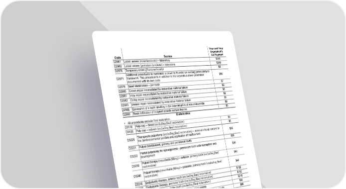 Page 6 of 22 MET245_SOB_CA (01/25) Fs/f GCERT2010-DHMO-SOB sob Code Service Your and Your Dependent's Co-Payment D2961 Labial veneer (resin laminate) – laboratory $300 D2962 Labial veneer (porcelain laminate) – laboratory $350 D2970 Temporary crown (fractured tooth) $0 D2971 Additional procedures to customize a crown to fit under an existing partial denture framework. This procedure is in addition to the separate a crown procedure documented with its own code. $50 D2976 Band stabilization – per tooth $7 D2980 Crown repair necessitated by restorative material failure $0 D2981 Inlay repair necessitated by restorative material failure $0 D2982 Onlay repair necessitated by restorative material failure $0 D2983 Veneer repair necessitated by restorative material failure $0 D2989 Excavation of a tooth resulting in the determination of non-restorability $0 D2990 Resin infiltration of incipient smooth surface lesions $0 Endodontics • All procedures exclude final restoration. D3110 Pulp cap – direct (excluding final restoration) $5 D3120 Pulp cap – indirect (excluding final restoration) $5 D3220 Therapeutic pulpotomy (excluding final restoration) – removal of pulp coronal to the dentinocemental junction and application of medicament $30 D3221 Pulpal debridement, primary and permanent teeth $55 D3222 Partial pulpotomy for apexogenesis - permanent tooth with incomplete root development $30 D3230 Pulpal therapy (resorbable filling) – anterior, primary tooth (excluding final restoration) $40 D3240 Pulpal therapy (resorbable filling) – posterior, primary tooth (excluding final restoration) $40 D3310 Endodontic therapy, anterior tooth (excluding final restoration) $100 D3320 Endodontic therapy, premolar tooth (excluding final restoration) $152 D3330 Endodontic therapy, molar tooth (excluding final restoration) $210 D3331 Treatment of root canal obstruction; non-surgical access $85 D3332 Incomplete endodontic therapy; inoperable, unrestorable or fractured tooth $96 D3333 Internal root repair of perforation defects: Non-surgical seal of perforation caused by resorption and/or decay but not iatrogenic by same provider. $85 D3346 Retreatment of previous root canal therapy – anterior $180 D3347 Retreatment of previous root canal therapy – premolar $280 D3348 Retreatment of previous root canal therapy – molar $325 D3351 Apexification/recalcification – initial visit (apical closure / calcific repair of perforations, root resorption, etc.) $70 D3352 Apexification/recalcification – interim medication replacement $70 D3353 Apexification/recalcification – final visit (includes completed root canal therapy – apical closure/calcific repair of perforations, root resorption, etc.) $70 D3355 Pulpal regeneration - initial visit $70 D3356 Pulpal regeneration - interim medication replacement $35