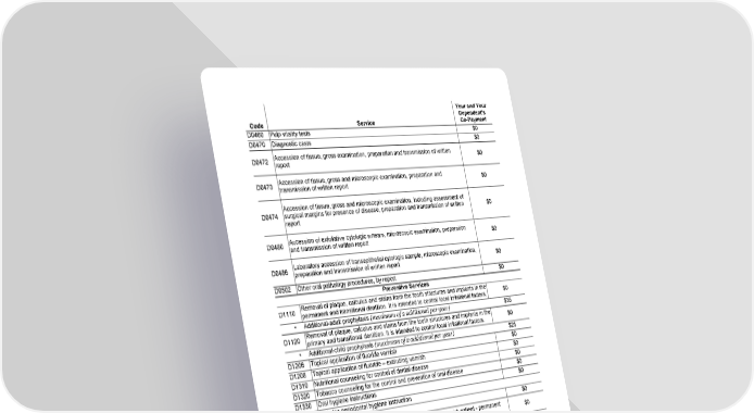Page 3 of 22 MET245_SOB_CA (01/25) Fs/f GCERT2010-DHMO-SOB sob Code Service Your and Your Dependent's Co-Payment D0460 Pulp vitality tests $0 D0470 Diagnostic casts $0 D0472 Accession of tissue, gross examination, preparation and transmission of written report $0 D0473 Accession of tissue, gross and microscopic examination, preparation and transmission of written report $0 D0474 Accession of tissue, gross and microscopic examination, including assessment of surgical margins for presence of disease, preparation and transmission of written report $0 D0480 Accession of exfoliative cytologic smears, microscopic examination, preparation and transmission of written report $0 D0486 Laboratory accession of transepithelial cytologic sample, microscopic examination, preparation and transmission of written report $0 D0502 Other oral pathology procedures, by report $0 Preventive Services D1110 Removal of plaque, calculus and stains from the tooth structures and implants in the permanent and transitional dentition. It is intended to control local irritational factors. $0 • Additional-adult prophylaxis (maximum of 2 additional per year) $35 D1120 Removal of plaque, calculus and stains from the tooth structures and implants in the primary and transitional dentition. It is intended to control local irritational factors. $0 • Additional-child prophylaxis (maximum of 2 additional per year) $25 D1206 Topical application of fluoride varnish $0 D1208 Topical application of fluoride – excluding varnish $0 D1310 Nutritional counseling for control of dental disease $0 D1320 Tobacco counseling for the control and prevention of oral disease $0 D1330 Oral hygiene instructions $0 • Includes periodontal hygiene instruction D1351 Sealant – per tooth $0 D1352 Preventive resin restoration in a moderate to high caries risk patient - permanent tooth $0 D1353 Sealant repair - per tooth $0 D1354 Application of caries arresting medicament – per tooth. Conservative treatment of an active, non-symptomatic carious lesion by topical application of a caries arresting or inhibiting medicament and without mechanical removal of sound tooth structure. $0 D1355 Caries preventive medicament application – per tooth $0 D1510 Space maintainer – fixed, unilateral – per quadrant Excludes a distal shoe space maintainer $25 D1516 Space maintainer – fixed – bilateral, maxillary $25 D1517 Space maintainer – fixed – bilateral, mandibular $25 D1520 Space maintainer – removable, unilateral – per quadrant $35 D1526 Space maintainer – removable – bilateral, maxillary $35 D1527 Space maintainer – removable – bilateral, mandibular $35