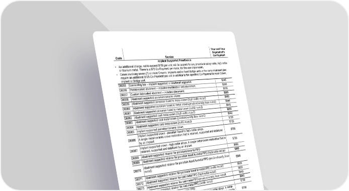 Page 12 of 22 MET245_SOB_CA (01/25) Fs/f GCERT2010-DHMO-SOB sob Code Service Your and Your Dependent's Co-Payment Implant Supported Prosthetics • An additional charge, not to exceed $150 per unit, will be applied for any procedure using noble, high noble or titanium metal. There is a $75 Co-Payment per molar, for the use of porcelain. • Cases involving seven (7) or more Crowns, implants and/or fixed Bridge units in the same treatment plan require an additional $125 Co-Payment per unit in addition to the specified Co-Payment for each Crown, implant or Bridge unit. D6055 Connecting bar – implant supported or abutment supported $345 D6056 Prefabricated abutment – includes modification and placement $245 D6057 Custom fabricated abutment – includes placement $335 D6058 Abutment supported porcelain/ceramic crown $685 D6059 Abutment supported porcelain fused to metal crown (high noble metal) $660 D6060 Abutment supported porcelain fused to metal crown (predominantly base metal) $640 D6061 Abutment supported porcelain fused to metal crown (noble metal) $645 D6062 Abutment supported cast metal crown (high noble metal) $655 D6063 Abutment supported cast metal crown (predominantly base metal) $640 D6064 Abutment supported cast metal crown (noble metal) $720 D6065 Implant supported porcelain/ceramic crown $725 D6066 Implant supported crown - porcelain fused to high noble alloys. A single metal-ceramic crown restoration that is retained, supported and stabilized by an implant $700 D6067 Implant supported crown - high noble alloys. A single metal crown restoration that is retained, supported and stabilized by an implant $725 D6068 Abutment supported retainer for porcelain/ceramic FPD $680 D6069 Abutment supported retainer for porcelain fused to metal FPD (high noble metal) $680 D6070 Abutment supported retainer for porcelain fused to metal FPD (predominantly base metal) $595 D6071 Abutment supported retainer for porcelain fused to metal FPD (noble metal) $635 D6072 Abutment supported retainer for cast metal FPD (high noble metal) $625 D6073 Abutment supported retainer for cast metal FPD (predominantly base metal) $445 D6074 Abutment supported retainer for cast metal FPD (noble metal) $640 D6075 Implant supported retainer for ceramic FPD $720 D6076 Implant supported retainer for FPD - porcelain fused to high noble alloys. A metal- ceramic retainer for a fixed partial denture that gains retention, support and stability from an implant $700 D6077 Implant supported retainer for metal FPD - high noble alloys. A metal retainer for a fixed partial denture that gains retention, support and stability from an implant $510 D6080 Implant maintenance procedures when prostheses are removed and reinserted, including cleansing of prosthesis and abutments $55 D6081 Scaling and debridement in the presence of inflammation or mucositis of a single implant, including cleaning of the implant surfaces, without flap entry and closure $17 D6082 Implant supported crown – porcelain fused to predominantly base alloys $640 D6083 Implant supported crown – porcelain fused to noble alloys $645 D6084 Implant supported crown – porcelain fused to titanium and titanium alloys $650 D6086 Implant supported crown – predominantly base alloys $640 D6087 Implant supported crown – noble alloys $720