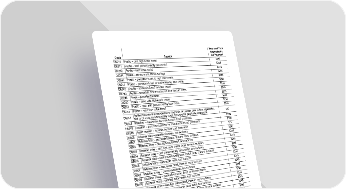 Page 14 of 22 MET245_SOB_CA (01/25) Fs/f GCERT2010-DHMO-SOB sob Code Service Your and Your Dependent's Co-Payment D6210 Pontic – cast high noble metal $245 D6211 Pontic – cast predominantly base metal $245 D6212 Pontic – cast noble metal $245 D6214 Pontic – titanium and titanium alloys $245 D6240 Pontic – porcelain fused to high noble metal $245 D6241 Pontic – porcelain fused to predominantly base metal $245 D6242 Pontic – porcelain fused to noble metal $245 D6243 Pontic – porcelain fused to titanium and titanium alloys $245 D6245 Pontic – porcelain/ceramic $265 D6250 Pontic – resin with high noble metal $245 D6251 Pontic – resin with predominantly base metal $245 D6252 Pontic – resin with noble metal $245 D6253 Further treatment or completion of diagnosis necessary prior to final impression. Not to be used as a temporary pontic for a routine prosthetic restoration. $70 D6545 Retainer – cast metal for resin bonded fixed prosthesis $100 D6548 Retainer – porcelain/ceramic for resin bonded fixed prosthesis $100 D6549 Resin retainer – for resin bonded fixed prosthesis $75 D6600 Retainer inlay – porcelain/ceramic, two surfaces $245 D6601 Retainer inlay – porcelain/ceramic, three or more surfaces $245 D6602 Retainer inlay – cast high noble metal, two surfaces $245 D6603 Retainer inlay – cast high noble metal, three or more surfaces $245 D6604 Retainer inlay – cast predominantly base metal, two surfaces $245 D6605 Retainer inlay – cast predominantly base metal, three or more surfaces $245 D6606 Retainer inlay – cast noble metal, two surfaces $245 D6607 Retainer inlay – cast noble metal, three or more surfaces $245 D6608 Retainer onlay – porcelain/ceramic, two surfaces $245 D6609 Retainer onlay – porcelain/ceramic, three or more surfaces $245 D6610 Retainer onlay – cast high noble metal, two surfaces $245 D6611 Retainer onlay – cast high noble metal, three or more surfaces $245 D6612 Retainer onlay – cast predominantly base metal, two surfaces $245 D6613 Retainer onlay – cast predominantly base metal, three or more surfaces $245 D6614 Retainer onlay – cast noble metal, two surfaces $245 D6615 Retainer onlay – cast noble metal, three or more surfaces $245 D6624 Retainer inlay – titanium $245 D6634 Retainer onlay – titanium $245 D6710 Retainer crown – indirect resin based composite $245 D6720 Retainer crown – resin with high noble metal $245 D6721 Retainer crown – resin with predominantly base metal $245 D6722 Retainer crown – resin with noble metal $245 D6740 Retainer crown – porcelain/ceramic $245 D6750 Retainer crown – porcelain fused to high noble metal $245 D6751 Retainer crown – porcelain fused to predominantly base metal $245 D6752 Retainer crown – porcelain fused to noble metal $245 D6753 Retainer crown – porcelain fused to titanium and titanium alloys $245 D6780 Retainer crown – ¾ cast high noble metal $245