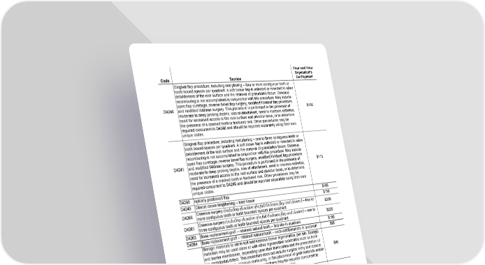 Page 8 of 22 MET245_SOB_CA (01/25) Fs/f GCERT2010-DHMO-SOB sob Code Service Your and Your Dependent's Co-Payment D4240 Gingival flap procedure, including root planing – four or more contiguous teeth or tooth bound spaces per quadrant: A soft tissue flap is reflected or resected to allow debridement of the root surface and the removal of granulation tissue. Osseous recontouring is not accomplished in conjunction with this procedure. May include open flap curettage, reverse bevel flap surgery, modified Kirkland flap procedure, and modified Widman surgery. This procedure is performed in the presence of moderate to deep probing depths, loss of attachment, need to maintain esthetics, need for increased access to the root surface and alveolar bone, or to determine the presence of a cracked tooth or fractured root. Other procedures may be required concurrent to D4240 and should be reported separately using their own unique codes. $150 D4241 Gingival flap procedure, including root planing – one to three contiguous teeth or tooth bound spaces per quadrant: A soft tissue flap is reflected or resected to allow debridement of the root surface and the removal of granulation tissue. Osseous recontouring is not accomplished in conjunction with this procedure. May include open flap curettage, reverse bevel flap surgery, modified Kirkland flap procedure, and modified Widman surgery. This procedure is performed in the presence of moderate to deep probing depths, loss of attachment, need to maintain esthetics, need for increased access to the root surface and alveolar bone, or to determine the presence of a cracked tooth or fractured root. Other procedures may be required concurrent to D4240 and should be reported separately using their own unique codes. $113 D4245 Apically positioned flap $165 D4249 Clinical crown lengthening – hard tissue $150 D4260 Osseous surgery (including elevation of a full thickness flap and closure) – four or more contiguous teeth or tooth bounded spaces per quadrant $300 D4261 Osseous surgery (including elevation of a full thickness flap and closure) – one to three contiguous teeth or tooth bounded spaces per quadrant $225 D4263 Bone replacement graft – retained natural tooth – first site in quadrant $180 D4264 Bone replacement graft – retained natural tooth – each additional site in quadrant $95 D4265 Biologic materials to aid in soft and osseous tissue regeneration, per site. Biologic materials may be used alone or with other regenerative substrates such as bone and barrier membranes, depending upon their formulation and the presentation of the periodontal defect. This procedure does not include surgical entry and closure, wound debridement, osseous contouring, or the placement of graft materials and/or barrier membranes. Other separate procedures may be required concurrent to D4265 and should be reported using their own unique codes. $95 D4266 Guided tissue regeneration, natural teeth – resorbable barrier, per site: This procedure does not include flap entry and closure, or, when indicated, wound debridement, osseous contouring, bone replacement grafts, and placement of biologic materials to aid in osseous regeneration. This procedure can be used for periodontal defects around natural teeth. $215 D4267 Guided tissue regeneration, natural teeth – non-resorbable barrier, per site: This procedure does not include flap entry and closure, or, when indicated, wound debridement, osseous contouring, bone replacement grafts, and placement of biologic materials to aid in osseous regeneration. This procedure can be used for periodontal defects around natural teeth. $255 D4268 Surgical revision procedure, per tooth $0 D4270 Pedicle soft tissue graft procedure $245 D4273 Autogenous connective tissue graft procedure (including donor and recipient surgical sites) first tooth, implant, or edentulous tooth position in graft $75