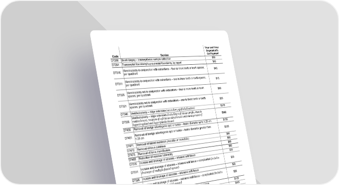Page 16 of 22 MET245_SOB_CA (01/25) Fs/f GCERT2010-DHMO-SOB sob Code Service Your and Your Dependent's Co-Payment D7288 Brush biopsy – transepithelial sample collection $50 D7291 Transseptal fiberotomy/supra crestal fiberotomy, by report $40 D7310 Alveoloplasty in conjunction with extractions – four or more teeth or tooth spaces, per quadrant $40 D7311 Alveoloplasty in conjunction with extractions – one to three teeth or tooth spaces, per quadrant $15 D7320 Alveoloplasty not in conjunction with extractions – four or more teeth or tooth spaces, per quadrant $60 D7321 Alveoloplasty not in conjunction with extractions – one to three teeth or tooth spaces, per quadrant $25 D7340 Vestibuloplasty – ridge extension (secondary epithelialization) $370 D7350 Vestibuloplasty – ridge extension (including soft tissue grafts, muscle reattachment, revision of soft tissue attachment and management of hypertrophied and hyperplastic tissue) $990 D7450 Removal of benign odontogenic cyst or tumor – lesion diameter up to 1.25 cm $130 D7451 Removal of benign odontogenic cyst or tumor – lesion diameter greater than 1.25 cm $335 D7471 Removal of lateral exostosis (maxilla or mandible) $80 D7472 Removal of torus palatinus $60 D7473 Removal of torus mandibularis $60 D7485 Reduction of osseous tuberosity $60 D7510 Incision and drainage of abscess – intraoral soft tissue $35 D7511 Incision and drainage of abscess – intraoral soft tissue – complicated (includes drainage of multiple fascial spaces) $35 D7520 Incision and drainage of abscess – extraoral soft tissue $35 D7521 Incision and drainage of abscess – extraoral soft tissue – complicated (includes drainage of multiple fascial spaces) $35 D7550 Partial ostectomy/sequestrectomy for removal of non-vital bone $125 D7560 Maxillary sinusotomy for removal of tooth fragment or foreign body $505 D7910 Suture of recent small wounds up to 5 cm $25 D7921 Collection and application of autologous blood concentrate product $95 D7950 Osseous, osteoperiosteal, or cartilage graft of the mandible or maxilla – autogenous or nonautogenous, by report $600 D7951 Sinus augmentation with bone or bone substitutes via a lateral open approach $825 D7952 Sinus augmentation via a vertical approach $825 D7953 Bone replacement graft for ridge preservation – per site $100 D7961 Buccal / labial frenectomy (frenulectomy) $50 D7962 lingual frenectomy (frenulectomy) $50 D7963 Frenuloplasty $50 D7970 Excision of hyperplastic tissue – per arch $55 D7971 Excision of pericoronal gingiva $40