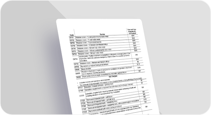 Page 15 of 22 MET245_SOB_CA (01/25) Fs/f GCERT2010-DHMO-SOB sob Code Service Your and Your Dependent's Co-Payment D6781 Retainer crown – ¾ cast predominantly base metal $245 D6782 Retainer crown – ¾ cast noble metal $245 D6783 Retainer crown – ¾ porcelain/ceramic $245 D6784 Retainer crown – ¾ titanium and titanium alloys $245 D6790 Retainer crown – full cast high noble metal $245 D6791 Retainer crown – full cast predominantly base metal $245 D6792 Retainer crown – full cast noble metal $245 D6793 Interim pontic. Further treatment or completion of diagnosis necessary prior to final impression. Not to be used as a temporary retainer crown for a routine prosthetic restoration. $70 D6794 Retainer crown – titanium and titanium alloys $245 D6930 Re-cement or re-bond fixed partial denture $0 D6940 Stress breaker $110 D6950 Precision attachment. A pair of components constitutes one precision attachment, that is separate from the prosthesis. $195 D6980 Fixed partial denture repair necessitated by restorative material failure $45 Oral Surgery • Includes routine post operative visits/treatment. • The removal of asymptomatic third molars is not a Covered Service unless pathology (disease) exists. D7111 Extraction, coronal remnants – primary tooth $5 D7140 Extraction, erupted tooth or exposed root (elevation and/or forceps removal) $5 D7210 Extraction, erupted tooth requiring removal of bone and/or sectioning of tooth and including elevation of mucoperiosteal flap if indicated $30 D7220 Removal of impacted tooth – soft tissue $50 D7230 Removal of impacted tooth – partially bony $65 D7240 Removal of impacted tooth – completely bony $80 D7241 Removal of impacted tooth – completely bony, with unusual surgical complications $100 D7250 Removal of residual tooth roots (cutting procedure) $40 D7251 Coronectomy – intentional partial tooth removal, impacted teeth only: Intentional partial tooth removal is performed when a neurovascular complication is likely if the entire tooth is removed. $80 D7252 Partial extraction for immediate implant placement Sectioning the root of a tooth vertically, then extracting the palatal portion of the root. The buccal section of the root is retained in order to stablize the buccal plate prior to immediate implant placement. Also known as the Socket Shield Technique. $60 D7260 Oroantral fistula closure $270 D7261 Primary closure of a sinus perforation $275 D7270 Tooth reimplantation and/or stabilization of accidentally evulsed or displaced tooth $50 D7280 Exposure of an unerupted tooth $100 D7282 Mobilization of erupted or malpositioned tooth to aid eruption $90 D7283 Placement of an attachment on an unerupted tooth, after its exposure, to aid in its eruption. Report the surgical exposure separately using D7280. $90 D7285 Incisional biopsy of oral tissue – hard (bone, tooth) $150 D7286 Incisional biopsy of oral tissue – soft $60 D7287 Exfoliative cytological sample collection $50