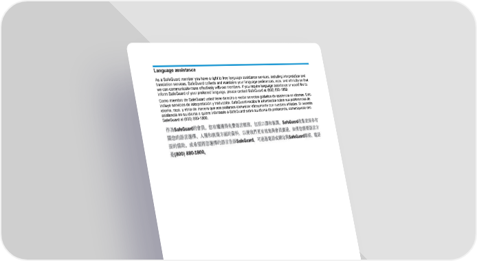 GCERT2010-DHMO-SOB Page 16 of 16 SGM_SOB_SGX_100-CA (01/24) Fs/f Language assistance As a SafeGuard member you have a right to free language assistance services, including interpretation and translation services. SafeGuard collects and maintains your language preferences, race, and ethnicity so that we can communicate more effectively with our members. If you require language assistance or would like to inform SafeGuard of your preferred language, please contact SafeGuard at (800) 880-1800. Como miembro de SafeGuard usted tiene derecho a recibir servicios gratuitos de asistencia en idiomas. Esto incluye servicios de interpretación y traducción. SafeGuard recaba la información sobre sus preferencias de idioma, raza, y etnia de manera que nos podamos comunicar eficazmente con nuestros afiliados. Si necesita asistencia en su idioma o quiere informarle a SafeGuard sobre su idioma de preferencia, comuníquese con SafeGuard al (800) 880-1800.