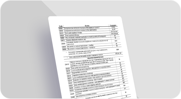 GCERT2010-DHMO-SOB sob Customer Service (800) 880-1800 Page 12 of 16 SGM_SOB_SGX_100-CA (01/24) Fs/f Code Service Co-payment D8080 Comprehensive orthodontic treatment of the adolescent dentition $1,450 D8090 Comprehensive orthodontic treatment of the adult dentition $1,450 D8210 Removable appliance therapy 25% Discount D8220 Fixed appliance therapy 25% Discount D8660 Pre-orthodontic treatment examination to monitor growth and development $0 D8670 Periodic orthodontic treatment visit $0 D8680 Orthodontic retention (removal of appliances, construction and placement of retainer(s)) $250 D8698 Re-cement or re-bond fixed retainer – maxillary $0 D8699 Re-cement or re-bond fixed retainer – mandibular $0 • Orthodontic treatment plan and records (pre/post x-rays (cephalometric, panoramic, etc.), photos, study models) $250 • Ortho visits beyond 24 months of active treatment or retention $25 per visit Adjunctive General Services D9110 Palliative treatment of dental pain per visit: Treatment that relieves pain but is not curative; services provided do not have distinct procedure codes. This is typically reported on a “per-visit” basis for emergency treatment of dental pain. $0 D9120 Fixed partial denture sectioning $0 D9210 Local anesthesia not in conjunction with operative or surgical procedures $0 D9211 Regional block anesthesia $0 D9212 Trigeminal division block anesthesia $0 D9215 Local anesthesia in conjunction with operative or surgical procedures $0 D9219 Evaluation for moderate sedation, deep sedation or general anesthesia $0 D9222 Deep sedation/general anesthesia – first 15 minutes $60 D9223 Deep sedation/general anesthesia – each subsequent 15 minute increment $60 D9230 Inhalation of nitrous oxide/analgesia, anxiolysis $15 D9239 Intravenous moderate (conscious) sedation/analgesia- first 15 minutes $60 D9243 Intravenous moderate (conscious) sedation/analgesia – each subsequent 15 minute increment $60 D9248 Non-intravenous conscious sedation $15 D9310 Consultation – diagnostic service provided by dentist or physician other than requesting dentist or physician $0 D9311 Consultation with a medical health care professional $0 D9430 Office visit for observation (during regularly scheduled hours) – no other services performed $0 D9440 Office visit – after regularly scheduled hours $15 D9450 Case presentation, subsequent to detailed and extensive treatment planning. $0 D9610 Therapeutic parenteral drug, single administration $15 D9612 Therapeutic parenteral drugs, two or more administrations, different medications $25 D9613 Infiltration of sustained release therapeutic drug, per quadrant. Infiltration of a sustained release pharmacologic agent for long acting surgical site pain control. Not for local anesthesia purposes. $15 D9630 Drugs or medicaments dispensed in the office for home use $15 D9910 Application of desensitizing medicament $15 D9942 Repair and/or reline of occlusal guard $40 D9944 Occlusal guard – hard appliance, full arch $85