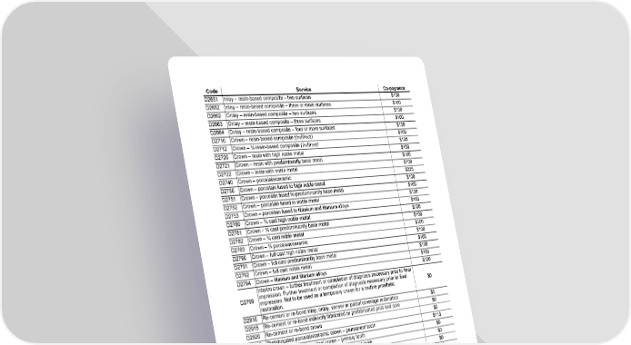 GCERT2010-DHMO-SOB sob Customer Service (800) 880-1800 Page 4 of 16 SGM_SOB_SGX_100-CA (01/24) Fs/f Code Service Co-payment D2651 Inlay – resin-based composite – two surfaces $100 D2652 Inlay – resin-based composite – three or more surfaces $100 D2662 Onlay – resin-based composite – two surfaces $100 D2663 Onlay – resin-based composite – three surfaces $100 D2664 Onlay – resin-based composite – four or more surfaces $100 D2710 Crown – resin-based composite (indirect) $100 D2712 Crown – ¾ resin-based composite (indirect) $100 D2720 Crown – resin with high noble metal $100 D2721 Crown – resin with predominantly base metal $100 D2722 Crown – resin with noble metal $100 D2740 Crown – porcelain/ceramic $225 D2750 Crown – porcelain fused to high noble metal $100 D2751 Crown – porcelain fused to predominantly base metal $100 D2752 Crown – porcelain fused to noble metal $100 D2753 Crown – porcelain fused to titanium and titanium alloys $100 D2780 Crown – ¾ cast high noble metal $100 D2781 Crown – ¾ cast predominantly base metal $100 D2782 Crown – ¾ cast noble metal $100 D2783 Crown – ¾ porcelain/ceramic $100 D2790 Crown – full cast high noble metal $100 D2791 Crown – full cast predominantly base metal $100 D2792 Crown – full cast noble metal $100 D2794 Crown – titanium and titanium alloys $100 D2799 Interim crown – further treatment or completion of diagnosis necessary prior to final impression. Further treatment or completion of diagnosis necessary prior to final impression. Not to be used as a temporary crown for a routine prosthetic restoration. $0 D2910 Re-cement or re-bond inlay, onlay, veneer or partial coverage restoration $0 D2915 Re-cement or re-bond indirectly fabricated or prefabricated post and core $0 D2920 Re-cement or re-bond crown $0 D2928 Prefabricated porcelain/ceramic crown – permanent tooth $113 D2930 Prefabricated stainless steel crown – primary tooth $0 D2931 Prefabricated stainless steel crown – permanent tooth $0 D2932 Prefabricated resin crown $0 D2933 Prefabricated stainless steel crown with resin window $0 D2940 Protective restoration $0 D2941 Interim therapeutic restoration - primary dentition $0 D2950 Core buildup, including any pins when required $15 D2951 Pin retention – per tooth, in addition to restoration $10 D2952 Post and core in addition to crown, indirectly fabricated $40 D2953 Each additional indirectly fabricated post – same tooth $40 D2954 Prefabricated post and core in addition to crown $40 D2955 Post removal $10 D2957 Each additional prefabricated post – same tooth $25 D2960 Labial veneer (resin laminate) – chairside $250 D2961 Labial veneer (resin laminate) – laboratory $300 D2962 Labial veneer (porcelain laminate) – laboratory $350