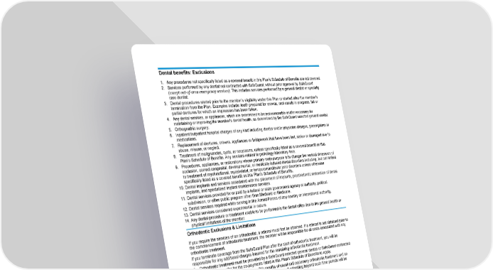 GCERT2010-DHMO-SOB exclusions Customer Service (800) 880-1800 Page 15 of 16 SGM_SOB_SGX_100-CA (01/24) Fs/f Dental benefits: Exclusions 1. Any procedures not specifically listed as a covered benefit in this Plan’s Schedule of Benefits are not covered. 2. Services performed by any dentist not contracted with SafeGuard, without prior approval by SafeGuard (except out-of-area emergency services). This includes services performed by a general dentist or specialty care dentist. 3. Dental procedures started prior to the member’s eligibility under this Plan or started after the member’s termination from the Plan. Examples include: teeth prepared for crowns, root canals in progress, full or partial dentures for which an impression has been taken. 4. Any dental services, or appliances, which are determined to be not reasonable and/or necessary for maintaining or improving the member’s dental health, as determined by the SafeGuard selected general dentist. 5. Orthognathic surgery. 6. Inpatient/outpatient hospital charges of any kind including dentist and/or physician charges, prescriptions or medications. 7. Replacement of dentures, crowns, appliances or bridgework that have been lost, stolen or damaged due to abuse, misuse, or neglect. 8. Treatment of malignancies, cysts, or neoplasms, unless specifically listed as a covered benefit on this Plan’s Schedule of Benefits. Any services related to pathology laboratory fees. 9. Procedures, appliances, or restorations whose primary main purpose is to change the vertical dimension of occlusion, correct congenital, developmental, or medically induced dental disorders including, but not limited to treatment of myofunctional, myoskeletal, or temporomandibular joint disorders unless otherwise specifically listed as a covered benefit on this Plan’s Schedule of Benefits. 10. Dental implants and services associated with the placement of implants, prosthodontic restoration of dental implants, and specialized implant maintenance services. 11. Dental services provided for or paid by a federal or state government agency or authority, political subdivision, or other public program other than Medicaid or Medicare. 12. Dental services required while serving in the Armed Forces of any country or international authority. 13. Dental services considered experimental in nature. 14. Any dental procedure or treatment unable to be performed in the dental office due to the general health or physical limitations of the member. Orthodontic Exclusions & Limitations If you require the services of an orthodontist, a referral must first be obtained. If a referral is not obtained prior to the commencement of orthodontic treatment, the member will be responsible for all costs associated with any orthodontic treatment. If you terminate coverage from the SafeGuard Plan after the start of orthodontic treatment, you will be responsible for any additional charges incurred for the remaining orthodontic treatment. 1. Orthodontic treatment must be provided by a SafeGuard selected general dentist or SafeGuard contracted orthodontist in order for the co-payments listed in this Plan’s Schedule of Benefits to apply. 2. Plan benefits shall cover twenty-four (24) months of usual and customary orthodontic treatment and an additional twenty-four (24) months of retention. Treatment extending beyond such time periods will be subject to a charge of $25 per visit. 3. The following are not included as orthodontic benefits: A. Repair or replacement of lost or broken appliances; B. Retreatment of orthodontic cases; C. Treatment involving: i. Maxillo-facial surgery, myofunctional therapy, cleft palate, micrognathia, macroglossia; ii. Hormonal imbalances or other factors affecting growth or developmental abnormalities; iii. Treatment related to temporomandibular joint disorders; iv. Composite or ceramic brackets, lingual adaptation of orthodontic bands and other specialized or cosmetic alternatives to standard fixed and removable orthodontic appliances. 4. The retention phase of treatment shall include the construction, placement, and adjustment of retainers. 5. Active orthodontic treatment in progress on your effective date of coverage is not covered. Active orthodontic treatment means tooth movement has begun.
