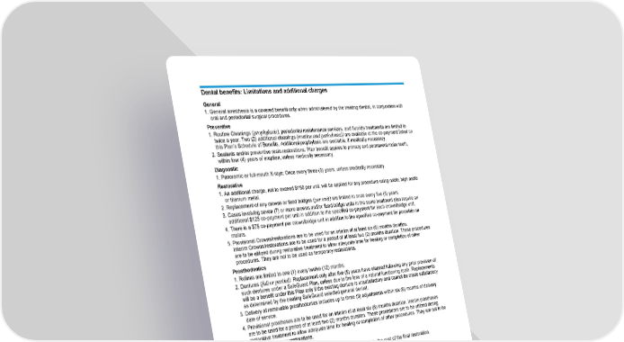 GCERT2010-DHMO-SOB limit Customer Service (800) 880-1800 Page 14 of 16 SGM_SOB_SGX_100-CA (01/24) Fs/f Dental benefits: Limitations and additional charges General 1. General anesthesia is a covered benefit only when administered by the treating dentist, in conjunction with oral and periodontal surgical procedures. Preventive 1. Routine Cleanings (prophylaxis), periodontal maintenance services, and fluoride treatments are limited to twice a year. Two (2) additional cleanings (routine and periodontal) are available at the co-payment listed on this Plan’s Schedule of Benefits. Additional prophylaxis are available, if medically necessary. 2. Sealants and/or preventive resin restorations: Plan benefit applies to primary and permanent molar teeth, within four (4) years of eruption, unless medically necessary. Diagnostic 1. Panoramic or full-mouth X-rays: Once every three (3) years, unless medically necessary. Restorative 1. An additional charge, not to exceed $150 per unit, will be applied for any procedure using noble, high noble or titanium metal. 2. Replacement of any crowns or fixed bridges (per unit) are limited to once every five (5) years. 3. Cases involving seven (7) or more crowns and/or fixed bridge units in the same treatment plan require an additional $125 co-payment per unit in addition to the specified co-payment for each crown/bridge unit. 4. There is a $75 co-payment per crown/bridge unit in addition to the specified co-payment for porcelain on molars. 5. Provisional Crowns/restorations are to be used for an interim of at least six (6) months duration. Interim Crowns/restorations are to be used for a period of at least two (2) months duration. These procedures are to be utilized during restorative treatment to allow adequate time for healing or completion of other procedures. They are not to be used as temporary restorations. Prosthodontics 1. Relines are limited to one (1) every twelve (12) months. 2. Dentures (full or partial): Replacement only after five (5) years have elapsed following any prior provision of such dentures under a SafeGuard Plan, unless due to the loss of a natural functioning tooth. Replacements will be a benefit under this Plan only if the existing denture is unsatisfactory and cannot be made satisfactory as determined by the treating SafeGuard selected general dentist. 3. Delivery of removable prosthodontics includes up to three (3) adjustments within six (6) months of delivery date of service. 4. Provisional prostheses are to be used for an interim of at least six (6) months duration. Interim prostheses are to be used for a period of at least two (2) months duration. These procedures are to be utilized during restorative treatment to allow adequate time for healing or completion of other procedures. They are not to be used as temporary restorations. Endodontics 1. The co-payments listed for endodontic procedures do not include the cost of the final restoration. Oral Surgery 1. The removal of asymptomatic third molars is not a covered benefit unless pathology (disease) exists.