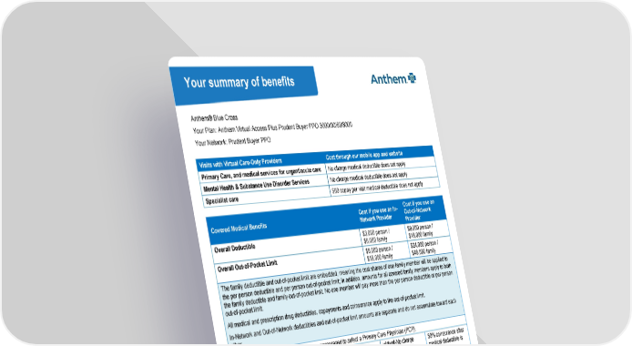 CA/LG/Anthem Virtual Access Plus Prudent Buyer PPO 3000/30/60/8000/9LMT/01-01-2026 Page 1 of 10 Your summary of benefits Anthem® Blue Cross Your Plan: Anthem Virtual Access Plus Prudent Buyer PPO 3000/30/60/8000 Your Network: Prudent Buyer PPO Visits with Virtual Care-Only Providers Cost through our mobile app and website Primary Care, and medical services for urgent/acute care No charge medical deductible does not apply Mental Health & Substance Use Disorder Services No charge medical deductible does not apply Specialist care $60 copay per visit medical deductible does not apply Covered Medical Benefits Cost if you use an In- Network Provider Cost if you use an Out-of-Network Provider Overall Deductible $3,000 person / $6,000 family $9,000 person / $18,000 family Overall Out-of-Pocket Limit $8,000 person / $16,000 family $24,000 person / $48,000 family The family deductible and out-of-pocket limit are embedded, meaning the cost shares of one family member will be applied to the per person deductible and per person out-of-pocket limit; in addition, amounts for all covered family members apply to both the family deductible and family out-of-pocket limit. No one member will pay more than the per person deductible or per person out-of-pocket limit. All medical and prescription drug deductibles, copayments and coinsurance apply to the out-of-pocket limit. In-Network and Out-of-Network deductibles and out-of-pocket limit amounts are separate and do not accumulate toward each other. Doctor Visits (virtual and office) You are encouraged to select a Primary Care Physician (PCP). Primary Care (PCP) and Mental Health and Substance Use Disorder Services virtual and office virtual-No charge medical deductible does not apply office-$30 copay per visit medical deductible does not apply 50% coinsurance after medical deductible is met Specialist Provider virtual and office $60 copay per visit medical deductible does not apply 50% coinsurance after medical deductible is met Other Practitioner Visits Maternity services Prenatal and Postpartum care $30 copay per visit medical deductible does not apply 50% coinsurance after medical deductible is met