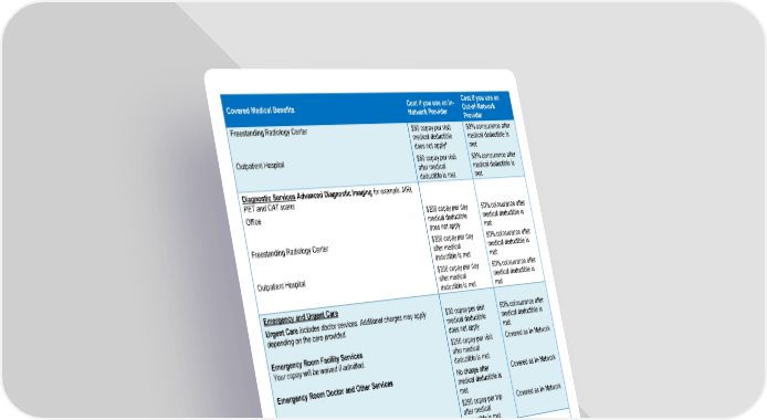 Page 3 of 10 Covered Medical Benefits Cost if you use an In- Network Provider Cost if you use an Out-of-Network Provider Freestanding Radiology Center $60 copay per visit medical deductible does not apply‡ 50% coinsurance after medical deductible is met Outpatient Hospital $60 copay per visit after medical deductible is met 50% coinsurance after medical deductible is met Diagnostic Services Advanced Diagnostic Imaging for example: MRI, PET and CAT scans Office $200 copay per day medical deductible does not apply 50% coinsurance after medical deductible is met Freestanding Radiology Center $200 copay per day after medical deductible is met 50% coinsurance after medical deductible is met Outpatient Hospital $200 copay per day after medical deductible is met 50% coinsurance after medical deductible is met Emergency and Urgent Care Urgent Care includes doctor services. Additional charges may apply depending on the care provided. $30 copay per visit medical deductible does not apply 50% coinsurance after medical deductible is met Emergency Room Facility Services Your copay will be waived if admitted. $250 copay per visit after medical deductible is met Covered as In-Network Emergency Room Doctor and Other Services No charge after medical deductible is met Covered as In-Network Ambulance $250 copay per trip after medical deductible is met Covered as In-Network Outpatient Mental Health and Substance Use Disorder Services at a Facility Facility Fees $500 copay per visit medical deductible does not apply 50% coinsurance after medical deductible is met Doctor Services No charge 50% coinsurance after medical deductible is met Outpatient Surgery Facility Fees Hospital $500 copay per visit after medical deductible is met 50% coinsurance after medical deductible is met
