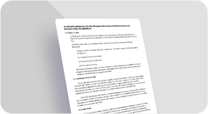 any third-party administrator of the Plan will supersede the procedures set forth below as long as such procedures comply with applicable law. 11.2 Filing A Claim (i) All claims for reimbursement from your Dependent Care spending accounts must be submitted during the Plan Year in which the expenses were incurred on or before 90 days immediately following the close of the Plan Year. (ii) With the claim form, you must submit a bill or receipt from the provider which gives the following information: (a) name and address of the provider and - in some cases - the provider's taxpayer identification number and signature; (b) the date(s) services were provided; (c) the type of service provided; and (d) who received the service. (iii) Instead of submitting a claim as set forth in (ii) above, the Plan Administrator has established a debit card program for the processing and reimbursement of all eligible benefits, and the details of such program will be explained to you if and when the program is established. 11.3 Notification Of Your Claim If any claim made under this Plan is wholly or partially denied, the Administrator will notify the person making such claim (the "claimant") of his or her decision in writing. You will receive a response to your claim within 90 days after your claim is submitted. More time may be required if there are special circumstances. If so, the Plan Administrator will contact you within the 90-day period. This notice will include an explanation as to why extra time is required and the date you can expect a decision. The extension will not exceed an additional 90 days. If the Plan Administrator fails to notify you within the designated time period, your claim will be considered to have been denied. Despite the foregoing, any claim made in connection with a Qualified Benefit Plan other than the Dependent Care Flexible Spending Account will be subject to review thereunder as required in Section 3.2 and will not be subject to review under this Article. 11.4 Claim Denial If all or part of your claim is denied, you will receive written notification explaining the reasons for the denial, reference to specific Plan provisions on which the denial is based, a description of any additional information or material needed to complete your claim and an explanation of why the information is necessary, and appropriate information about the Plan's claims review procedures, including a statement of your right to bring a lawsuit following a denial on review. 11.5 Appealing A Denied Claim If your claim is denied and you wish to appeal, you must file your appeal with the Plan Administrator within 60 days after you receive the denial. Your appeal should include any additional information that you wish the Plan Administrator to consider. If your appeal is not filed within this 60-day period, you will not be able to appeal your claim. The Plan Administrator will notify you in writing within 60 days after your appeal is received. If there are special circumstances, more time may be necessary to review your appeal. You may be asked to wait an additional 60 days for a decision. If all or part of your claim on appeal is denied, you will receive written notification explaining the reasons for the denial and reference to the specific Plan provisions on which the denial is based, a statement that you are entitled to receive, upon request and free of charge, reasonable access to, and copies of, all documents, records and other information relevant to your claim, and a statement of your right to bring a lawsuit following a denial on review. The decision will be final and binding on all parties. If you do not receive a written response from the Plan Administrator within the designated time period, your appeal will be considered to have been denied. Page 17