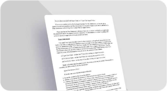 For procedures associated with Urgent Claims, see "Urgent Claim Appeals" below. If you are not satisfied with the first level appeal decision of the Plan Administrator, you have the right to request a second level appeal from the Plan Administrator. Your second level appeal request must be submitted to the Plan Administrator within 60 days from receipt of first level appeal decision. Please note that the Plan Administrator's decision is based only on whether or not benefits are available under the group health plan for the proposed treatment or procedure. The determination as to whether the pending health service is necessary or appropriate is between you and your doctor. Urgent Claim Appeals Your appeal may require immediate action if a delay in treatment could significantly increase the risk to your health or the ability to regain maximum function or cause severe pain. In these urgent situations, the appeal does not need to be submitted in writing. You or your doctor should call the Plan Administrator as soon as possible, and provide the Plan Administrator with the information identified above under "How to Appeal a Claim Decision." The Plan Administrator will provide you with a written or electronic determination within 72 hours following receipt of your request for review of the determination taking into account the seriousness of your condition. (i) Urgent Care Claims - not later than 72 hours after receiving your request for a review. (ii) Pre-Service Claims - not later than 30 days after receiving your request for a review. (iii) Post-Service Claims - not later than 60 days after receiving your request for a review. Similar to the initial claim determination period, these review periods may be extended. If these periods are extended, you will be notified by the Plan Administrator. Appeal Determination Notice If denied, your review decision on appeal will include: the specific reason(s) for the adverse determination; reference to the specific Plan provision on which the benefit determination is based; a statement that you are entitled to receive, without charge, reasonable access to any document (i) relied on in making the determination, (ii) submitted, considered, or generated in the course of making the benefit determination, (iii) that demonstrates compliance with the administrative processes and safeguards required in making the determination, or (iv) that constitutes a statement of policy or guidance with respect to the Plan concerning the denied treatment without regard to whether the statement was relied on; either the specific rule or guideline used in making your benefits determination or a statement that such a rule or guideline was relied upon in making the determination and that a copy of such rule or guideline will be provided free of charge upon request; if the adverse determination is based on medical necessity or experimental treatment or a similar exclusion or limit, either an explanation of the scientific or clinical judgment applying the terms of the Plan to your medical condition, or a statement that such explanation will be provided without charge on request; a statement describing the Plan's optional appeals procedures, and your right to receive information about such procedures, as well as your right to bring a lawsuit; and the following statement: "You and your Plan may have other voluntary alternative dispute resolution options, such as mediation. One way to find out what may be available is to contact your local U.S. Department of Labor Office and your State insurance regulatory agency." If you file an internal appeal for medical benefits, you will continue to be covered pending the outcome of the internal appeal. This means that the Plan shall not terminate or reduce any ongoing course of treatment without providing advance notice and the opportunity for review. Page 21