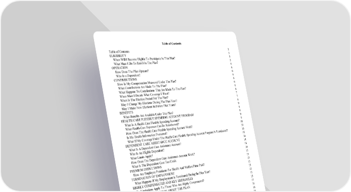 3 5 5 5 6 6 6 6 6 6 6 6 7 7 9 9 9 9 9 9 10 10 10 14 14 14 14 14 15 15 15 15 15 15 15 15 15 16 16 16 16 16 16 18 18 18 18 19 19 19 20 21 21 23 23 Table of Contents Table of Contents ELIGIBILITY When Will I Become Eligible To Participate In This Plan? What Must I Do To Enroll In The Plan? OPERATION How Does The Plan Operate? Who Is a Dependent? CONTRIBUTIONS How Is My Compensation Measured Under The Plan? What Contributions Are Made To The Plan? What Happens To Contributions That Are Made To The Plan? When Must I Decide What Coverage I Want? When Is The Election Period For The Plan? May I Change My Elections During The Plan Year? May I Make New Elections In Future Plan Years? BENEFITS What Benefits Are Available Under The Plan? HEALTH CARE FLEXIBLE SPENDING ACCOUNT PROGRAM What Is A Health Care Flexible Spending Account? What Health Care Expenses Can Be Reimbursed? How Does The Health Care Flexible Spending Account Work? Is My Health Information Protected? What If My Coverage Under The Health Care Flexible Spending Account Program Is Terminated? DEPENDENT CARE ASSISTANCE ACCOUNT What Is A Dependent Care Assistance Account? Who Is An Eligible Dependent? What Limits Apply? How Does The Dependent Care Assistance Account Work? What Is The Dependent Care Tax Credit PREMIUM DEDUCTIONS How Are Employee Premiums For Health And Welfare Plans Paid? TERMINATION OF EMPLOYMENT What Happens If My Employment is Terminated During the Plan Year? HIGHLY COMPENSATED AND KEY EMPLOYEES Do Limitations Apply To Those Who Are Highly Compensated? GENERAL INFORMATION ABOUT THE PLAN General Plan Information Employer Information Plan Administrator Information Service Of Legal Process Type Of Administration ADDITIONAL PLAN INFORMATION ERISA Rights And Protections Filing A Claim Notification Of Your Claim Claim Denial Appealing A Denied Claim HEALTH CARE CLAIM PROCEDURES Health Care Claim Definition Filing A Health Care Claim Notification Of Your Health Care Claim Health Care Claim Denial Appealing A Denied Health Care Claim APPENDIX A Qualifying Health Care Expenses
