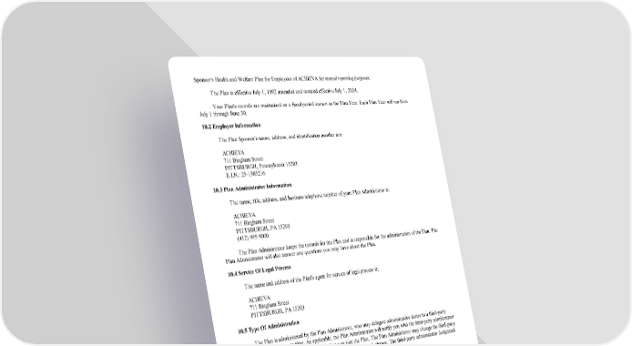 Sponsor's Health and Welfare Plan for Employees of ACHIEVA for annual reporting purposes. The Plan is effective July 1, 1992 amended and restated effective July 1, 2024. Your Plan's records are maintained on a fiscal period known as the Plan Year. Each Plan Year will run from July 1 through June 30. 10.2 Employer Information The Plan Sponsor's name, address, and identification number are: ACHIEVA 711 Bingham Street PITTSBURGH, Pennsylvania 15203 E.I.N.: 25-1505216 10.3 Plan Administrator Information The name, title, address, and business telephone number of your Plan Administrator is: ACHIEVA 711 Bingham Street PITTSBURGH, PA 15203 (412) 995-5000 The Plan Administrator keeps the records for the Plan and is responsible for the administration of the Plan. The Plan Administrator will also answer any questions you may have about the Plan. 10.4 Service Of Legal Process The name and address of the Plan's agent for service of legal process is: ACHIEVA 711 Bingham Street PITTSBURGH, PA 15203 10.5 Type Of Administration The Plan is administered by the Plan Administrator, who may delegate administrative duties to a third-party administrator from time to time. As applicable, the Plan Administrator will notify you who the third-party administrator is, and any applicable contact information, when you join the Plan. The Plan Administrator may change the third-party administrator from time to time, and you will be notified of any such change. The third-party administrator designated by the Plan Administrator is: UPMC Benefit Management Service PO Box 2784 Fargo, ND 58108 Telephone: (844) 220-4785 XI. ADDITIONAL PLAN INFORMATION 11.1 ERISA Rights And Protections Your Rights Under ERISA As a participant in the Plan, you are entitled to certain rights and protections under the Employee Retirement Income Security Act of 1974 (ERISA). ERISA provides that all Plan participants are entitled to: (i) Examine, without charge, at the Plan Administrator's office and at other specified locations, such as worksites and union halls, all documents governing the Plan, including insurance contracts and collective bargaining Page 15