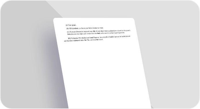 (ii) Your spouse. (iii) All dependents you list on your federal income tax return. (iv) If you are divorced or separated, any child of yours that is listed as a dependent on his or her other parent's federal income tax return (and certain other individuals in the case of a multiple support agreement). IRS Publication 502, Medical and Dental Expenses, has a checklist of medical expenses that can be deducted and therefore reimbursed under this Plan, and those that cannot. Page 23