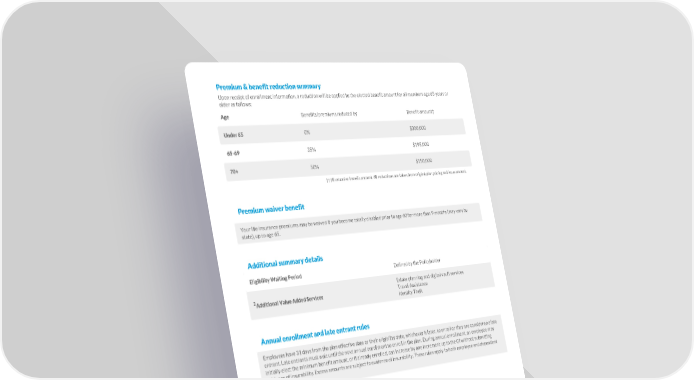 Premium & benefit reduction summary Upon receipt of enrollment information, a reduction will be applied to the elected benefit amount for all members age 65 years or older as follows: Age Benefits/premiums reduced by Benefit amount† Under 65 0% $300,000 65-69 35% $195,000 70+ 50% $150,000 †††Illustrative benefit amount. All reductions are taken from original plan pricing and issue amount. Premium waiver benefit Your life insurance premiums may be waived if you become totally disabled prior to age 60 for more than 9 months (may vary by state), up to age 65. Additional summary details Eligibility Waiting Period Defined by the Policyholder Estate planning and digital vault services 2 Travel Assistance Additional Value Added Services Identity Theft Annual enrollment and late entrant rules Employees have 31 days from the plan effective date or their eligibility date, whichever is later, to enroll or they are considered a late entrant. Late entrants must wait until the next annual enrollment to enroll in the plan. During annual enrollment, an employee may initially elect the minimum benefit amount, or if already enrolled, can increase by one increment up to the GI without submitting evidence of insurability. Excess amounts are subject to evidence of insurability. These rules apply to both employee and dependent life options. BEAM SUPPORT LEARN MORE support@beambenefits.com | (800) 648 1179 beambenefits.com BM-SOB-0041-202306 2 of 3